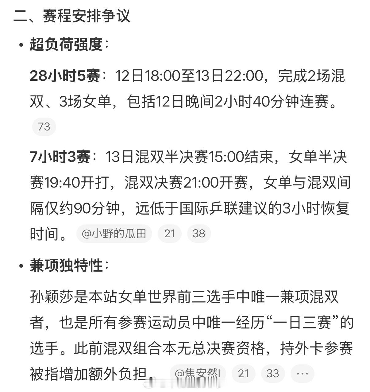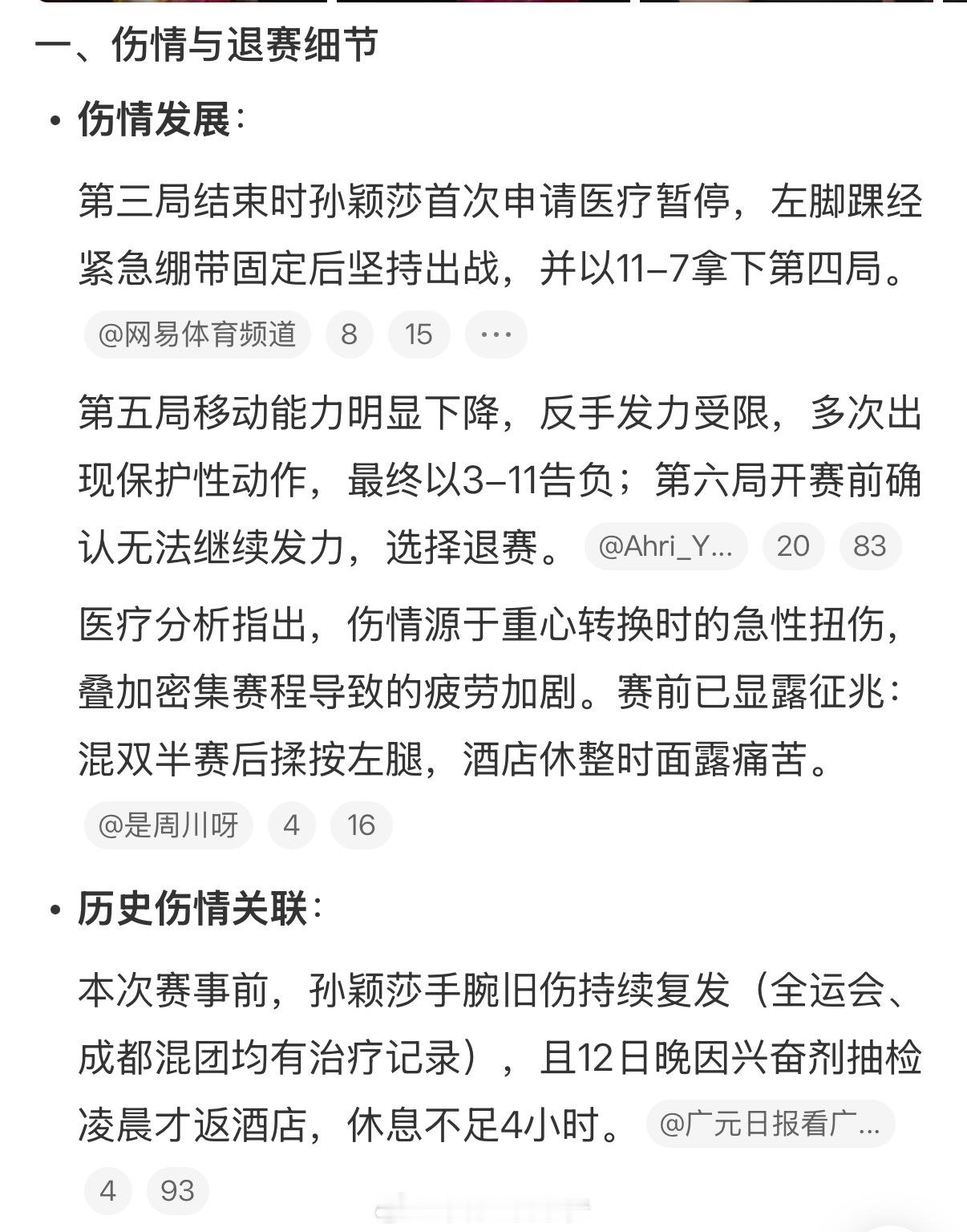 孙颖莎受伤退赛看孙颖莎香港总决赛的比赛,真是揪心。第三局脚踝扭伤,缠着绷带硬撑,第四局还咬牙拿下。可到第五局,移动明显受限,反手发力都困难,最后只能退赛。其实赛前就有征兆,混双半赛后她揉着左腿,酒店休整时也一脸痛苦。这站比赛她太累了,28小时连打5场,13日更是90分钟连赛两场,远低于国际乒联建议的恢复时间。而且她是女单世界前三里唯一兼项混双的,还是唯一“一日三赛”的选手。大家都心疼她,教练组没合理安排体能和轮换被批评,主办方为票房牺牲运动员健康的质疑声也不小。竞技体育拼实力,但也得有对运动员的基本保护。希望莎莎好好养伤,健康比什么都重要。