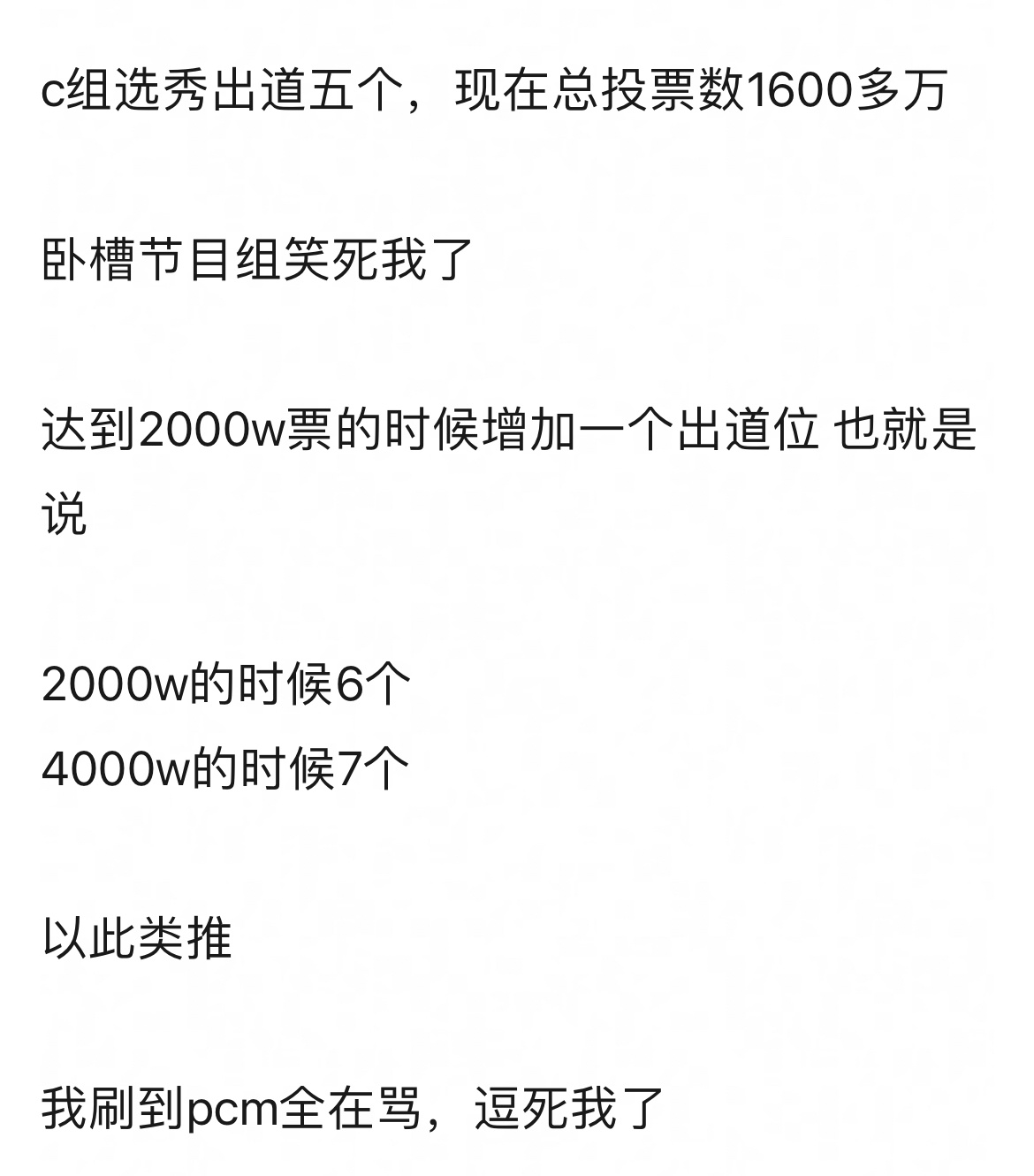 C组选秀还能这样?出道五个,现在总投票数1600多万达到2000w票增加一个出道位 2000w的时候6个,4000w的时候7个,以此类推