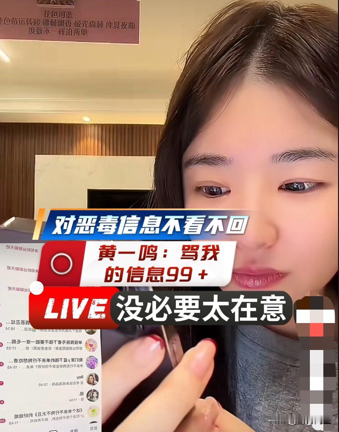 黄一鸣内核很稳,应对恶毒私信:不看,不回 吃互联网这碗饭,成也流量,败也流量。不管你有多红,总有人不喜欢你。 有一些网红陷入过与黑粉的战争,比如在网络上曾红极一时的张兰,还有杜星霖,崔丽丽,这些网络名人采用发动粉丝群回怼、报警等方式,陷入了恶性循环。 黄一鸣在网络上也是个颇具争议的存在,她的直播间里常常出现令人尴尬的场面,说她想碰瓷大款,私生子的话题满天飞。 黄一鸣开直播,淡定从容,她扬起手机,显示后台有99+的未读私信。黄一鸣说:“这些私信我都不打开看,网络上什么圈层的人都有,总不能别人骂我,我也要骂回去吧”。 意外之意,既然靠网络吃饭,就别跟网友过不去。看到骂声就当没看见,专注做好自己的内容,稳住心态才是长久之道。 这番话是26岁的黄一鸣最清醒的生存智慧。作为单亲妈妈,她把网络视为谋生场而非情绪战场,因此,她不和网友们争高低,那些恶毒私信不是需要“解决”的问题,而是这份工作必然的“背景噪声”。黄一鸣的“不看”,是主动过滤杂音,把有限的精力精准投注于直播带货与变现。 年轻的黄一鸣对流量本质有着透彻的理解:网友可能是情绪喷发,而她的账号与收入却需要长久维系。不卷入骂战,是不让私人情绪干扰商业逻辑——她卖的是商品与陪伴感,而非情绪价值上的针锋相对。黄一鸣这种拎得清,恰是她在互联网里捞金捞的长久的核心竞争力。