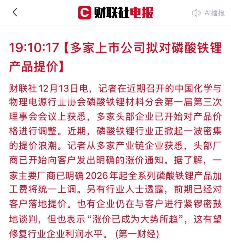 重磅!磷酸铁锂集体涨价,电池产业链迎来大利好!刚刚,据中国化学与物理电源行业协会icon传出重磅消息:磷酸铁锂材料行业正在掀起一波密集提价浪潮,多家头部企业已向客户发出明确的涨价通知,2026年起加工费将统一上调。此次全行业范围内的价格调整,预示着经历长期价格低迷后,锂电产业链有望迎来盈利能力的关键修复期。受益方向梳理:1.磷酸铁锂正极材料企业:直接生产销售磷酸铁锂,涨价将直接增厚其利润。· 万润新能:行业领军者,手握宁德时代超百万吨的长期订单,业绩弹性足。· 富临精工:核心产品是市场紧缺的高压实密度磷酸铁锂,此类高端产品涨幅可能更大,盈利能力提升空间显著。· 湖南裕能:头部厂商之一,此前已率先与客户落实涨价,行业拐点信号明确。·德方纳米:头部厂商,有望受益于产品结构性涨价和行业整体盈利修复。·龙蟠科技:公司获得了宁德时代、亿纬锂能等头部电池厂的长协订单,行业涨价,有利于其业绩兑现。2.上游关键原材料企业:磷酸铁锂需求回暖,必将拉动对其核心原料的需求。· 赣锋锂业:全球锂业龙头,其碳酸锂icon产品是磷酸铁锂的锂源。下游景气度提升,将对锂价形成重要支撑。本次提价是下游需求持续旺盛与高端产品供给结构性紧张的共同结果,标志着行业竞争重心从“价格战”转向“价值战”。拥有技术壁垒、优质客户和成本优势的龙头企业,预计将成为此轮周期修复中的主要受益者。