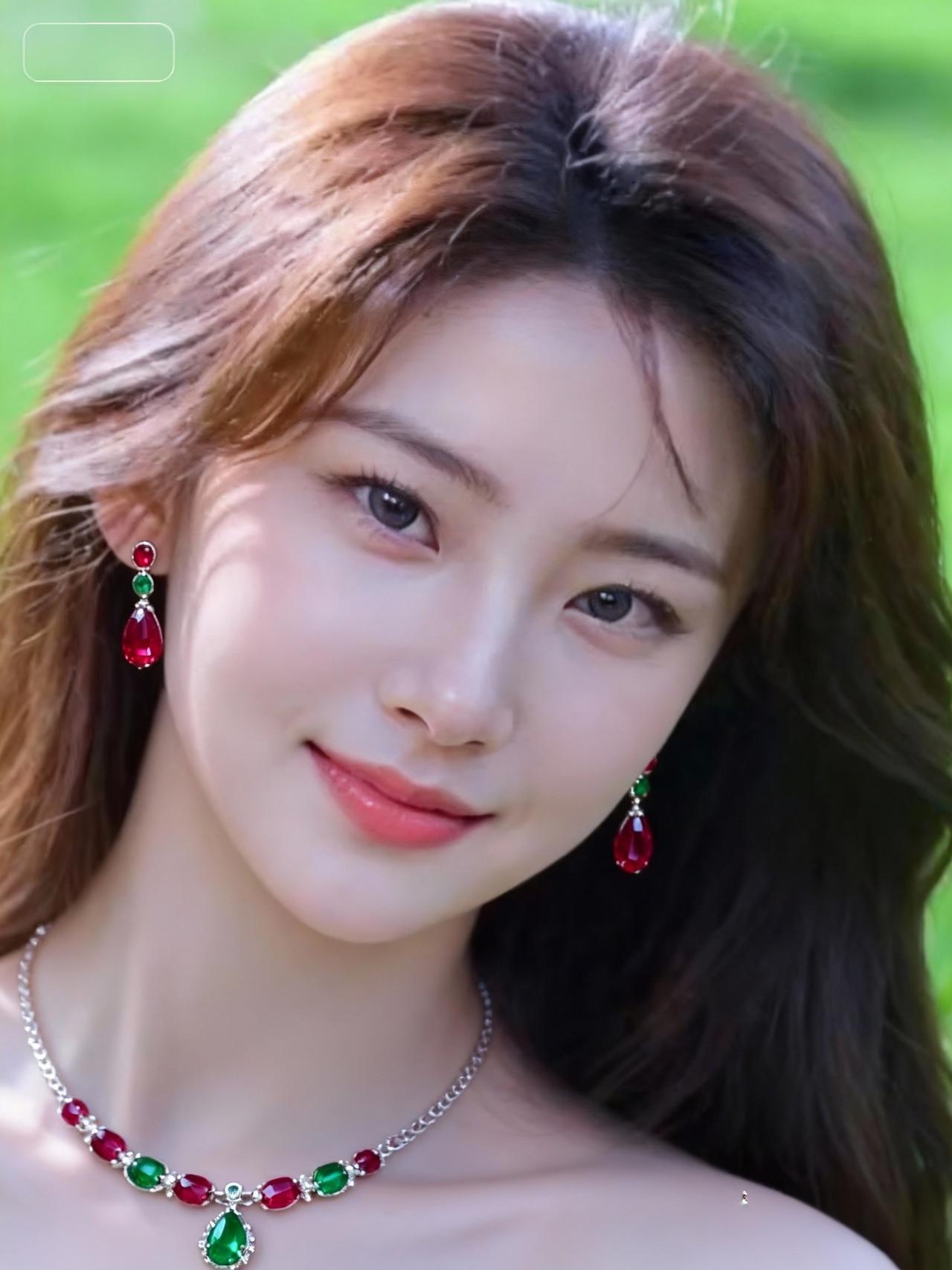 温柔甜美的少女,红宝石耳环与绿宝石项链相得益彰,尽显优雅气质。