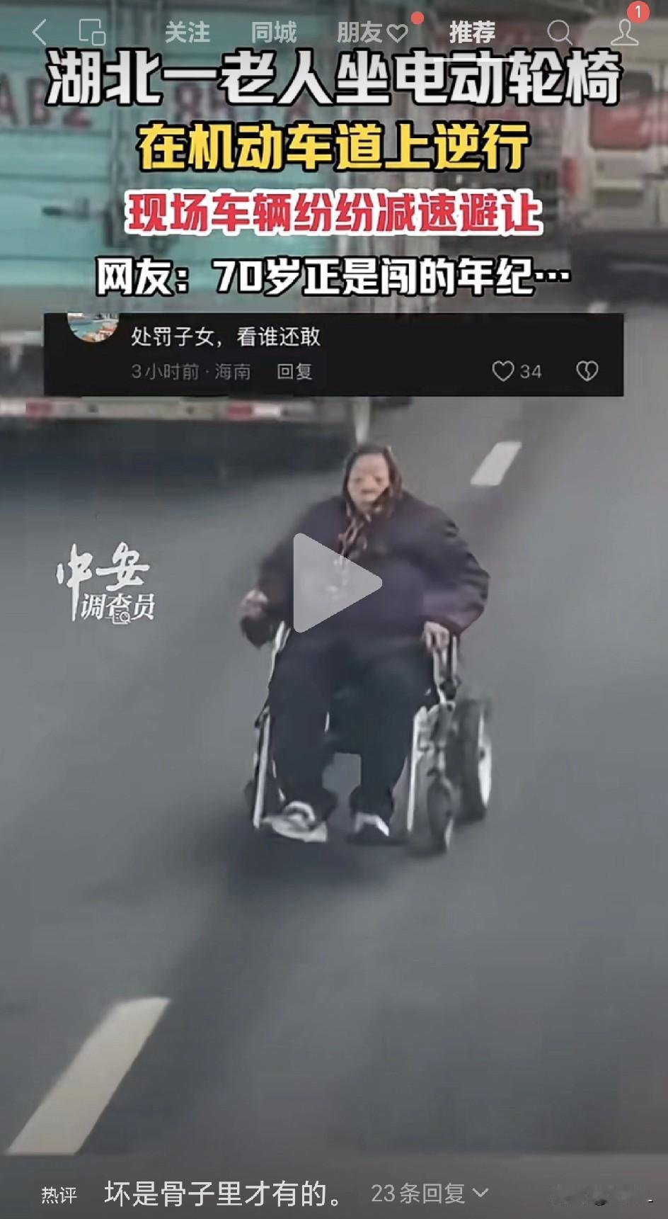 湖北大姨开电动轮椅闯入机动车道,在车流中逆行惊呆路人:正是爱闯的年纪! 近日,湖北街头出现惊险一幕:一位头发花白的大姨,竟然开着电动轮椅,大摇大摆地驶入了机动车道,还玩起了逆行! 只见滚滚车流中,大姨稳坐轮椅,一路前行。来往车辆猝不及防,纷纷急踩刹车减速避让,一时间喇叭声此起彼伏。 而轮椅上的大姨却面不改色,颇有几分“一夫当关,万夫莫开”的气势。 这一幕被路人拍下上传网络,瞬间炸开了锅。网友们的评论更是笑中带泪: “您这轮椅是改装过的吧?带涡轮增压不?” “70岁怎么了?70岁正是闯的年纪!” “大姨:科目三我考了八次,这次必须上主路找找感觉。” “这轮椅比我的电动车跑得还稳当,求链接!” “司机们心里苦:这要是碰上了,算谁的责任啊?” 笑归笑,但仔细一想,实在让人捏把冷汗。机动车道车来车往,速度都不慢,年轻人走在上面都心惊胆战,何况是坐在轮椅上的老人?万一有个闪失,后果不堪设想。 据了解,电动轮椅按规定应该在人行道上行驶,最高时速也不能超过6公里/小时。 像大姨这样开上机动车道还逆行的,简直是把自己置于危险之中,也让正常行驶的司机们措手不及。 有附近居民猜测,大姨可能是图方便,不愿意绕远路走人行道;也有人担心,是不是老人独自出门,有点迷糊找不着路了? 不管是哪种情况,都提醒我们多关注身边老人的出行安全。 家里的“老小孩”们有时候确实会做出让人哭笑不得的事。他们可能觉得自己经验丰富,或者就是倔脾气上来了。但安全无小事,尤其是交通出行,半点马虎不得。 这件事也给所有做子女的提了个醒:多回家看看,多跟父母唠唠,了解他们的日常出行方式。 如果老人腿脚不便需要代步工具,一定要教会他们正确使用方法,强调交通规则。必要时,可以考虑陪同出行。 大姨的“潇洒逆行”虽然被网友调侃“正是闯的年纪”,但咱可不能真让老人家在这个年纪去“闯关”。 安全第一,平安才是福啊! 信息来源于中安新闻,侵联删!