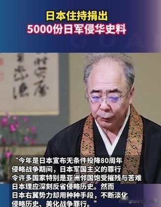 日本爱知县圆光寺住持大东仁,自2005年起坚持向中国捐赠侵华日军史料,至今已累计约5000份。这些史料涵盖日军官方文件、士兵日记、报纸等,是揭示侵华日军罪行的铁证。面对日本右翼攻击,他始终据理力争,以史料为武器捍卫历史真相。他坚信,史料是通往和平的第一步,愿为铭记历史、促进和平不懈努力。