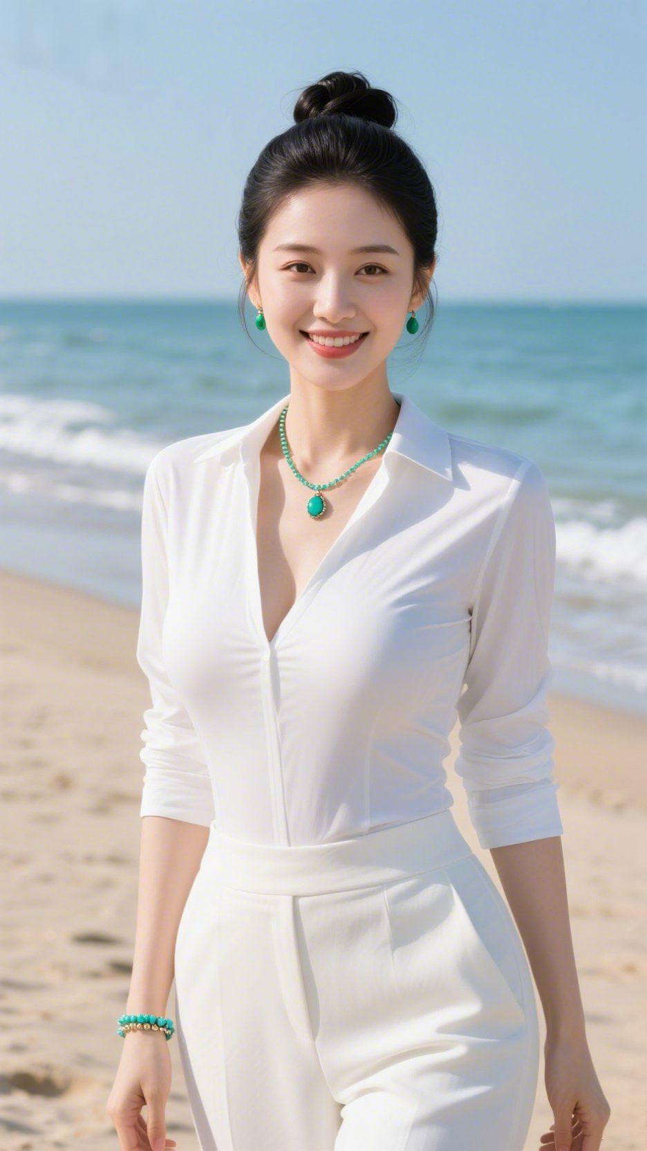 白衫与海畔清光 海风吹软了沙,她立在浪声里,一身白装似将晴空揉作衣装,舒展得像漫过滩的柔浪。发梢挽作轻圆的髻,耳腕间的松石色像蘸了海的蓝,落在笑眼里,连风都裹着咸暖的轻。 她的笑是浪尖跳的光,不晃眼,只漫着松弛的亮——像刚触过温沙的轻,像掌心拢着的碎贝,是海畔时光里最妥帖的舒展。白衫的软裹着风,裤褶的纹藏着懒,连脚步都踩着浪的节奏,慢得刚好。 最动人的从不是海的汹涌,是这样轻缓的契合:像白衫融了天,像笑意裹了浪,目光落处,便觉时光都浸在了海的温柔里。 海畔舒展意 晴空白衫美