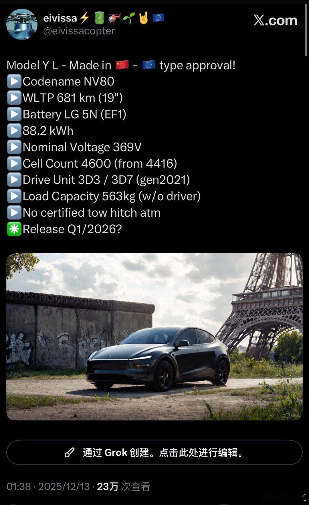 在中国区大卖的Tesla 6座版Model YL已获得欧盟认证,预计最快在2026年第一季度在欧洲上市:-代号 NV80-WLTP+19 英寸轮毂续航681公里-LG 5N 电池组(EF1) 88.2kWh-标称电压369V-电芯数量4600-驱动单元3D3/3D7-载重能力563kg-暂无认证拖车钩