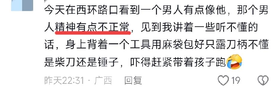 悬赏10万的嫌犯据称叫李涛,54岁,身高165,11号在广西柳城马山镇田村屯的甘蔗地里袭击了两位干活的妇女。 有网友反映他是宜州人,老婆是田村屯的。 那两个妇女在李涛的养猪场旁边的甘蔗地正在劳作,不知什么情况他就对两人下了毒手,然后骑了一辆9成新的电驴子逃逸。 这种人越早抓到越好,年过半百还戾气这么重。 (以上内容来源网络,一切以官报为准)