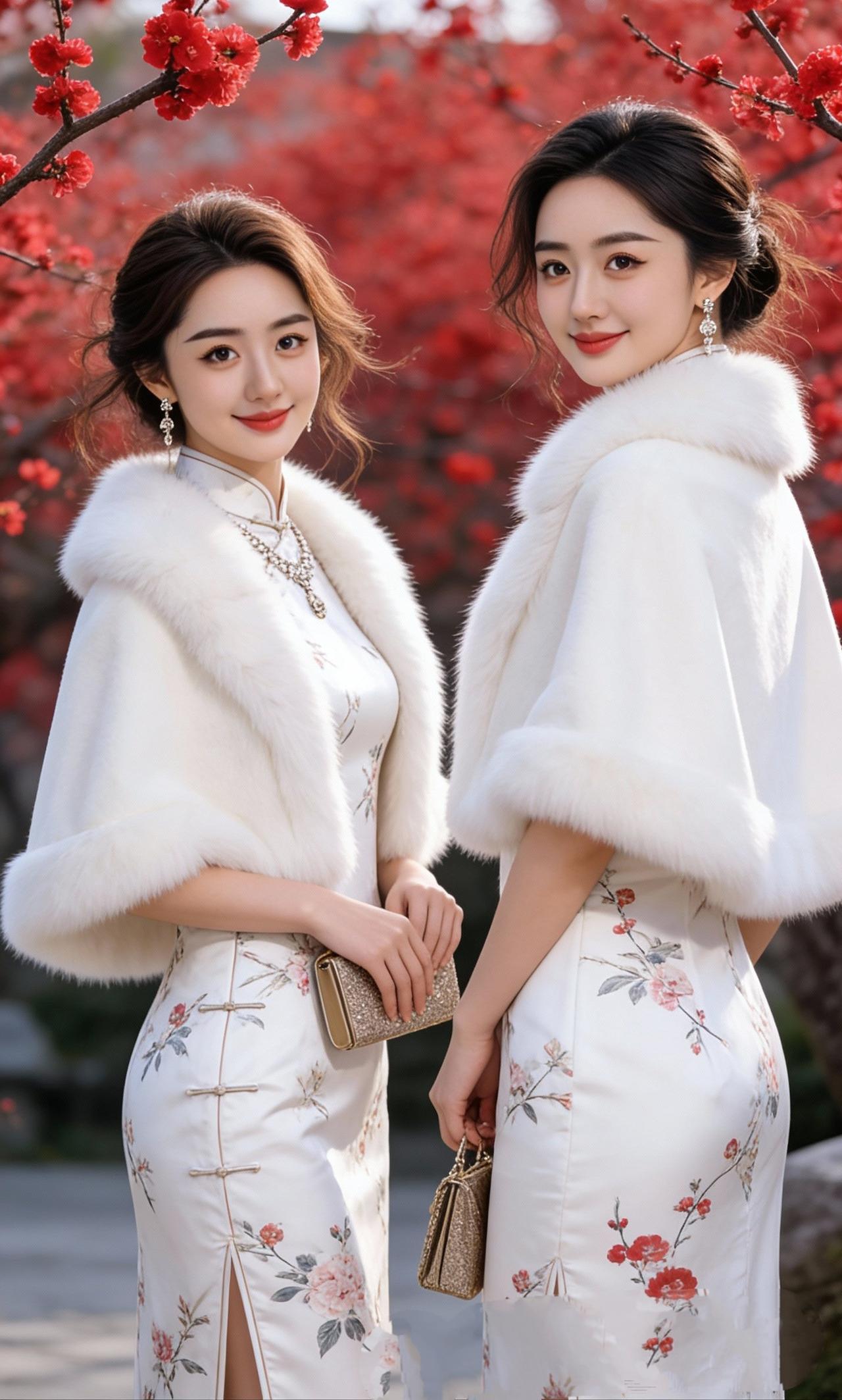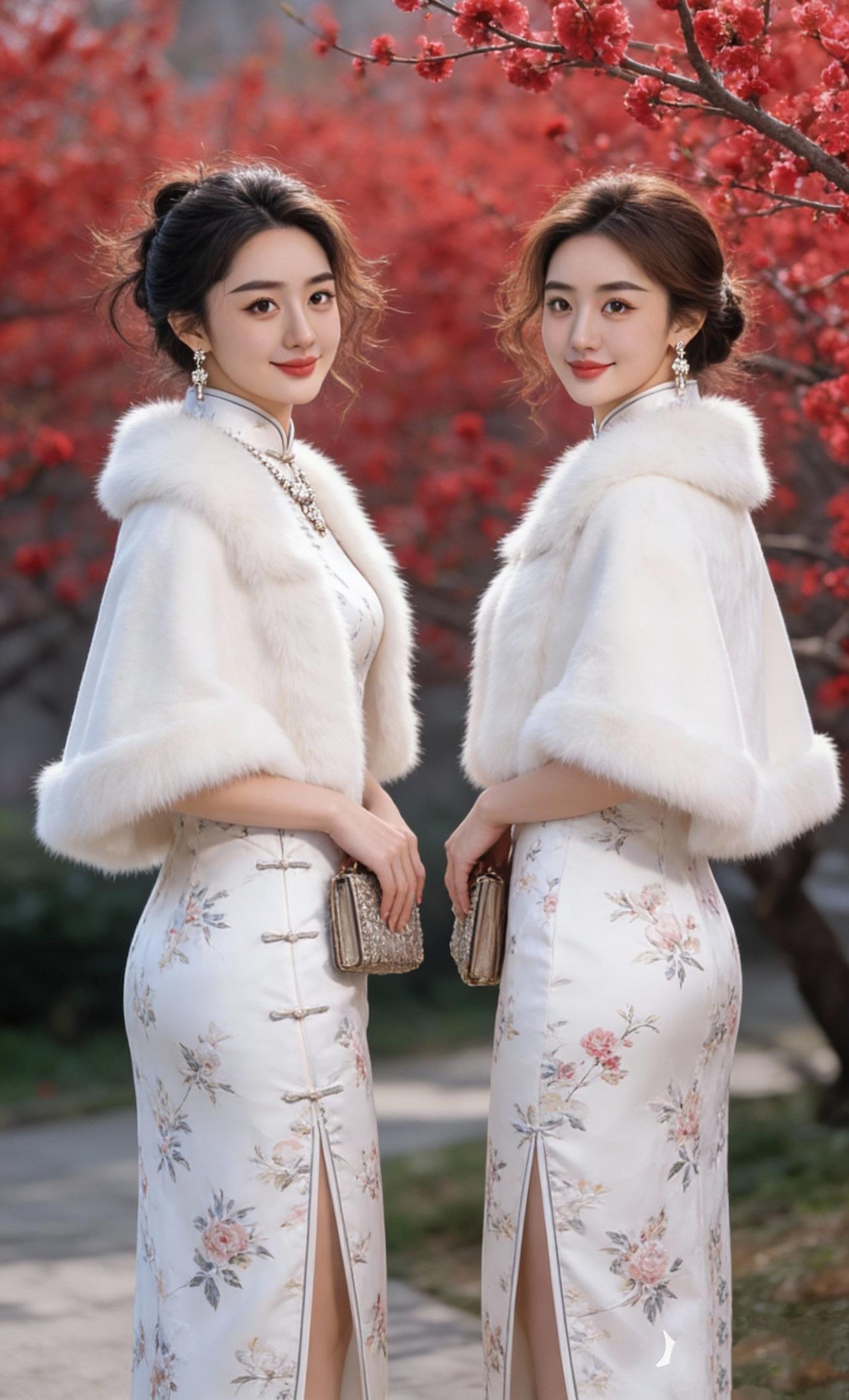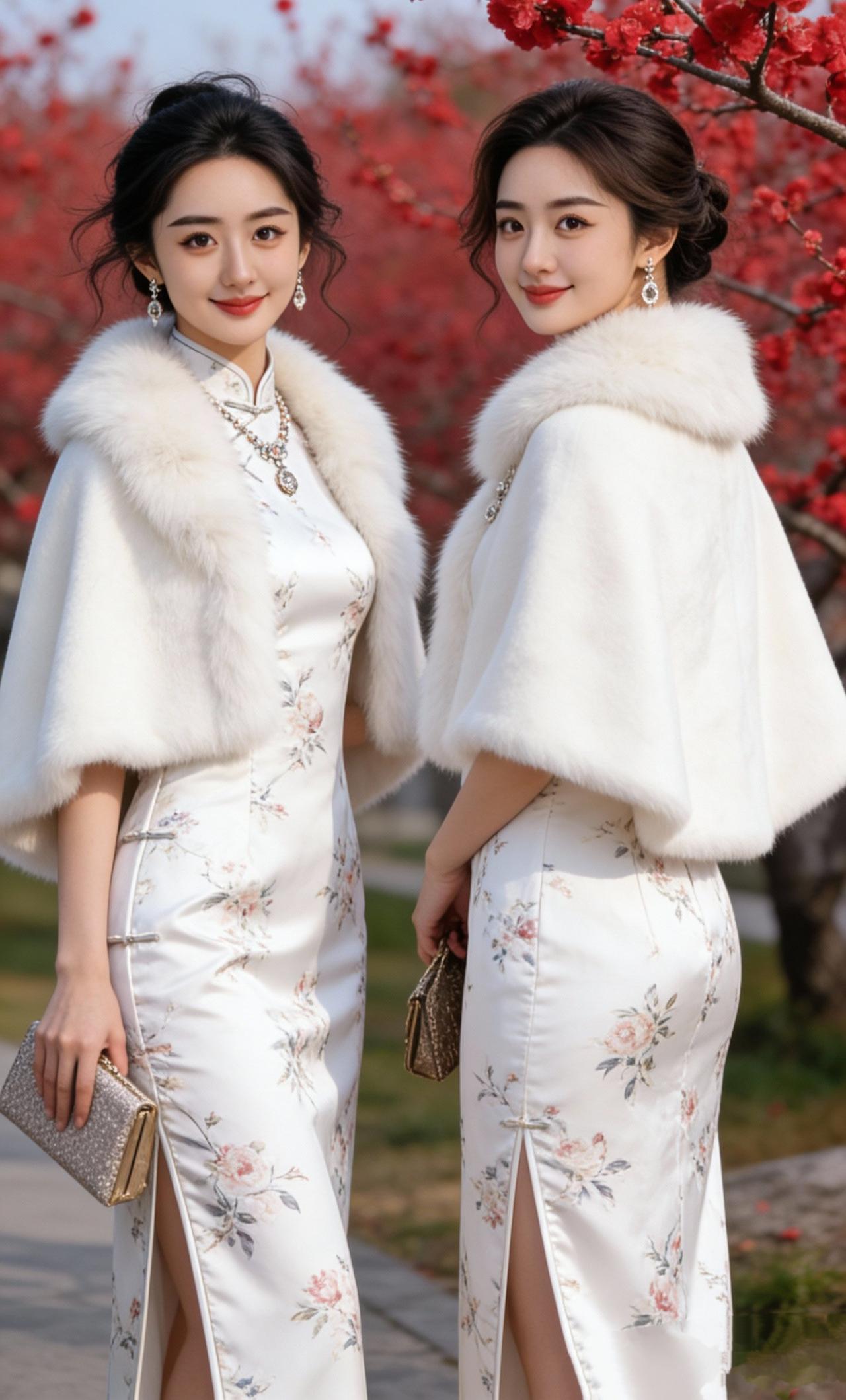 《梅下旗韵》 丹蕊纷披覆野丘,虬枝凝艳惹眸柔。 霜风漫卷红云色,漫作天边一抹流。 玉影双姝临梅下,素貂裁雪裹肩头。 斜簪珠珰摇清浅,轻挽云鬟衬凤眸。 旗衫裁取冰绡质,暗绣寒英绕襟周。 盘扣玲珑凝雅意,衩边微露玉阶秋。 金钗小盒携香细,步缓犹随暗香浮。 梅魂入袂添风骨,旗韵涵春锁画楼。 不借胭脂争俗艳,只凭清致占枝头。 嫣然一笑东风里,半是梅花半是羞。 原创雪韵联 踏雪韵诗 雪韵诗词 梅雪诗词 梅冬之韵 梅枝清韵图