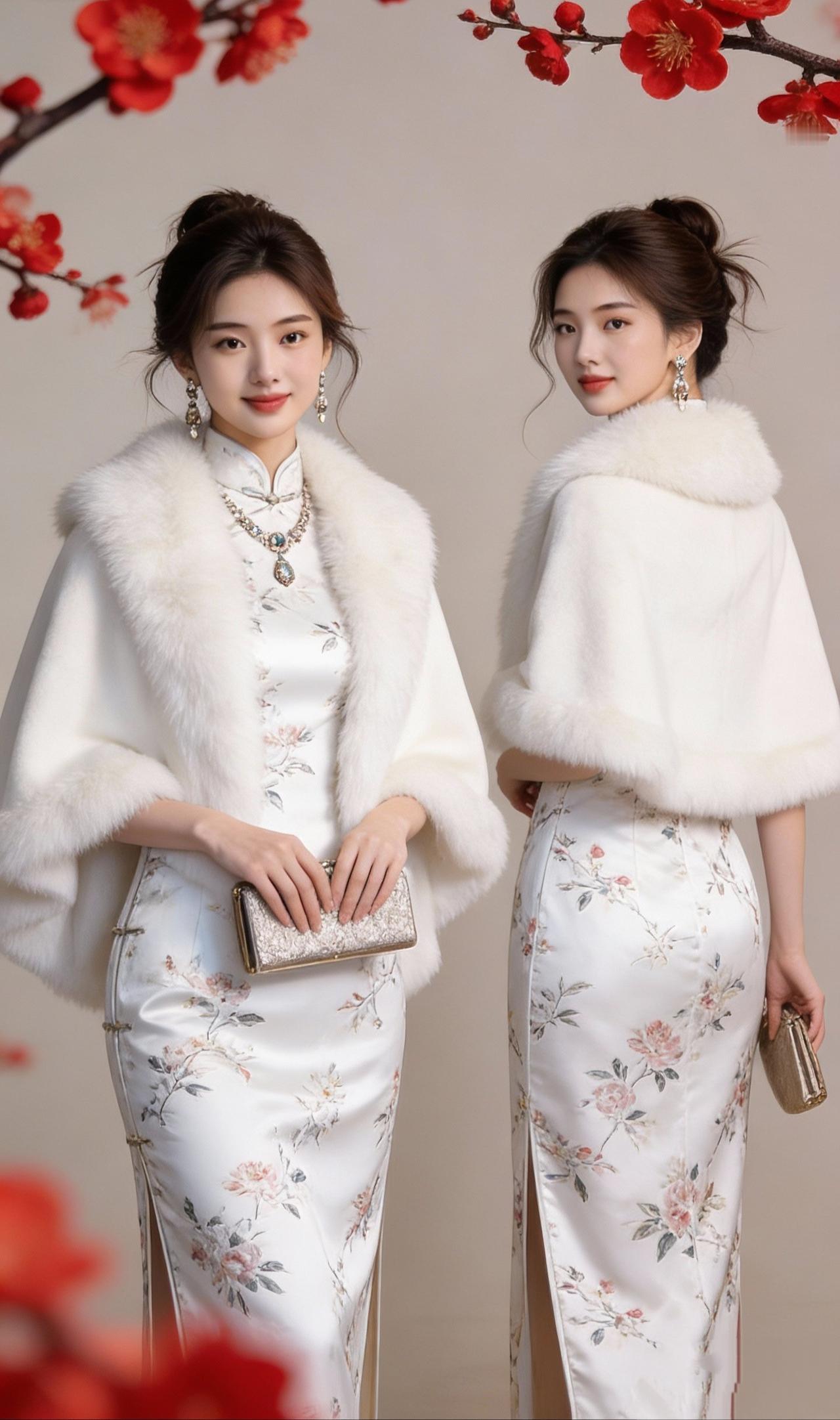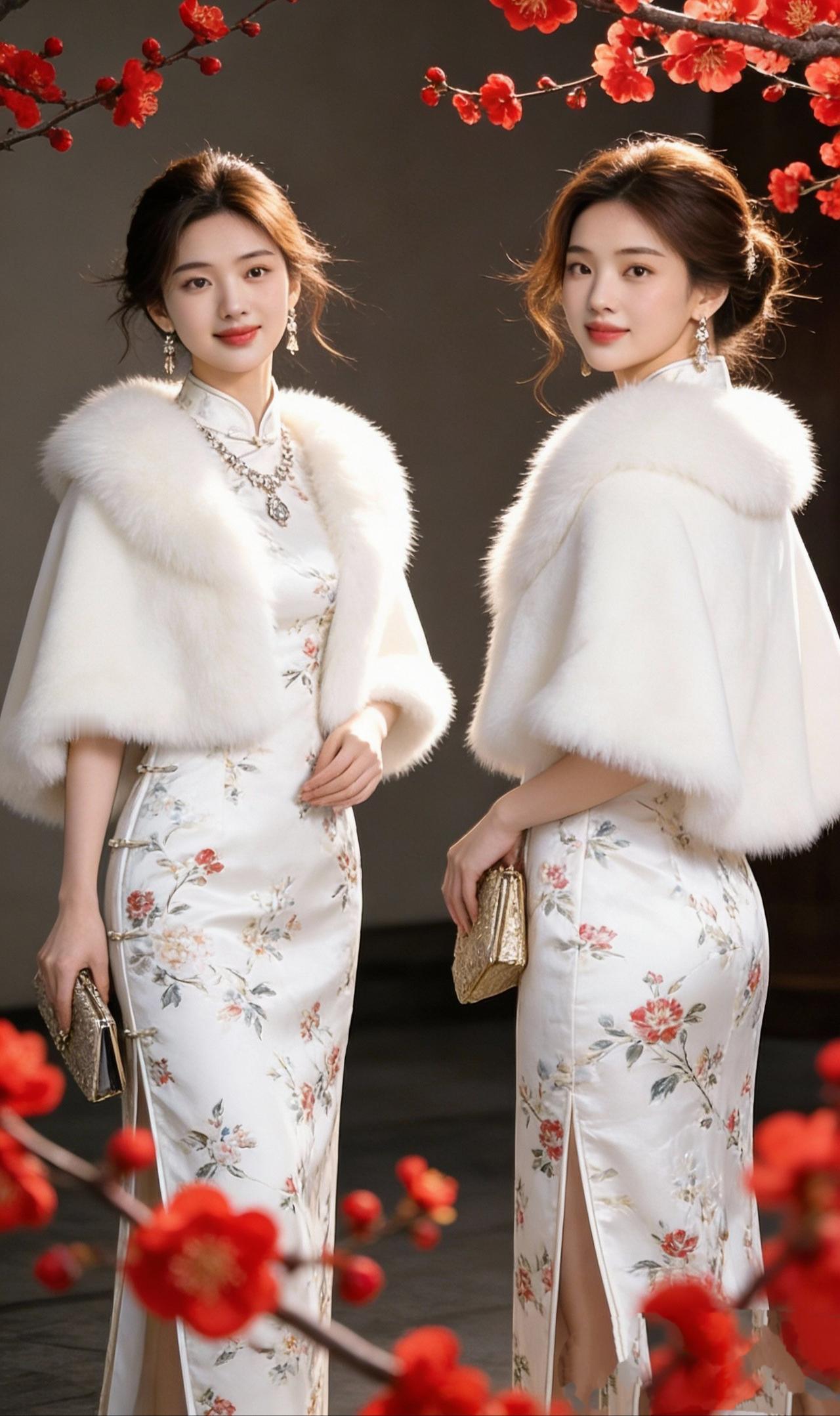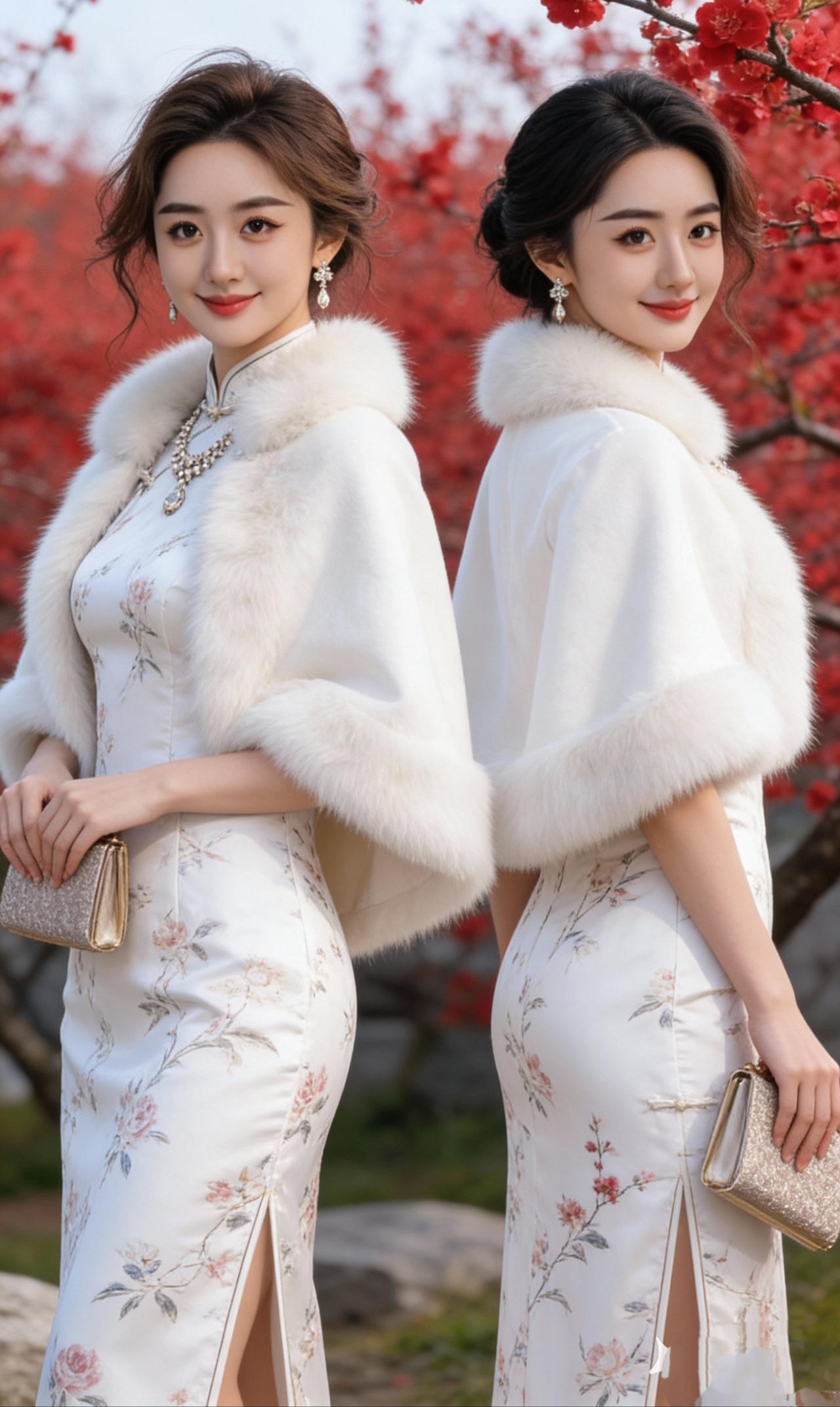 《梅下旗韵》 丹蕊纷披覆野丘,虬枝凝艳惹眸柔。 霜风漫卷红云色,漫作天边一抹流。 玉影双姝临梅下,素貂裁雪裹肩头。 斜簪珠珰摇清浅,轻挽云鬟衬凤眸。 旗衫裁取冰绡质,暗绣寒英绕襟周。 盘扣玲珑凝雅意,衩边微露玉阶秋。 金钗小盒携香细,步缓犹随暗香浮。 梅魂入袂添风骨,旗韵涵春锁画楼。 不借胭脂争俗艳,只凭清致占枝头。 嫣然一笑东风里,半是梅花半是羞。 原创雪韵联 踏雪韵诗 雪韵诗词 梅雪诗词 梅冬之韵 梅枝清韵图