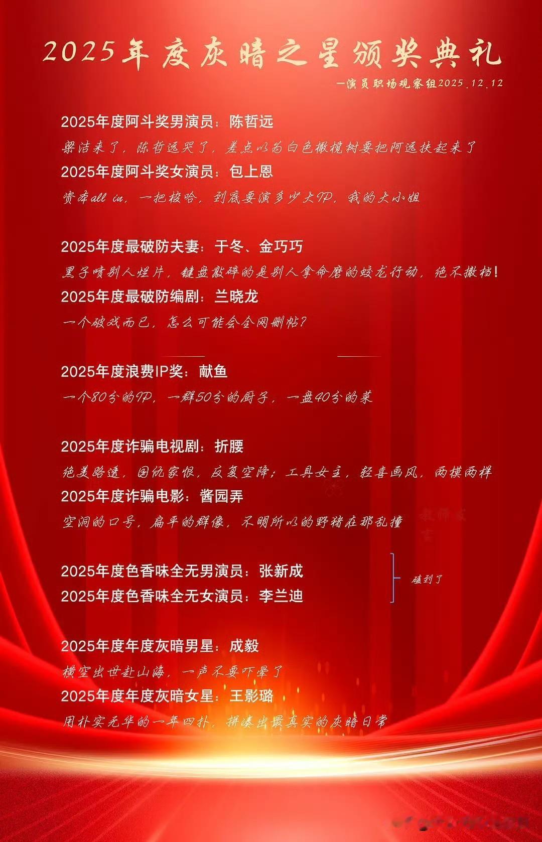豆瓣搞了个明星“颁奖典礼”,陈哲远章子怡上榜了[捂脸][捂脸]。 阿斗奖男女主——陈哲远和包上恩。 最破防夫妻,于冬金巧巧 最破防编剧,兰晓龙 最诈骗电影,酱园弄 最灰暗🔝男星,成毅 坦白讲,这个“获奖名单”比那个金扫帚奖还要充满讽刺意味。 但是看了名单,又觉得大部分“获奖者”还都挺客观合理。 反驳都拿不出很好的理由。 只能闷声吃哑巴亏了。 [捂脸]