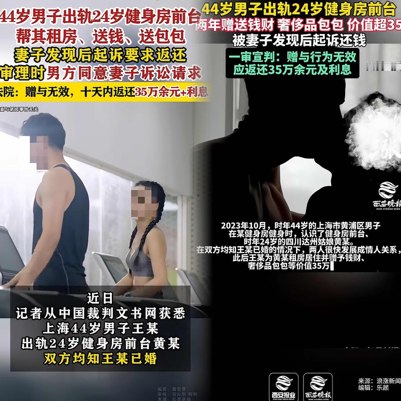 “白嫖?”上海,44岁已婚男子与24岁健身房前台发生不正当关系,短短16个月就给对方花了近47万元。男子妻子得知后,不愿意了欲将男子及其情人告上法庭,要求情人还钱。 别再说“知三当三”只受道德谴责了!上海这案子直接给幻想靠婚外情捞好处的人泼了盆冷水,所谓的“馈赠”根本就是空中楼阁。 44岁已婚男16个月砸47万给小20岁的情人,看着挺大方,可妻子一较真,他立马倒戈,账单、录音全交了出去。法院判返还35万多,不是因为男方反悔,而是法律压根不保护这种违背公序良俗的赠与。 有人替情人喊“白嫖”,这思路太歪了。她明知对方已婚还接受大额财物,本身就站不住脚。更关键的是,夫妻共同财产不是一方想送就能送的,哪怕花的是男人自己挣的钱,也得夫妻俩点头。 这判决根本不是“白嫖”,是给所有人划了红线:靠破坏别人家庭谋利,不仅名声扫地,到手的钱也得吐出来。你觉得这判决够有震慑力吗?