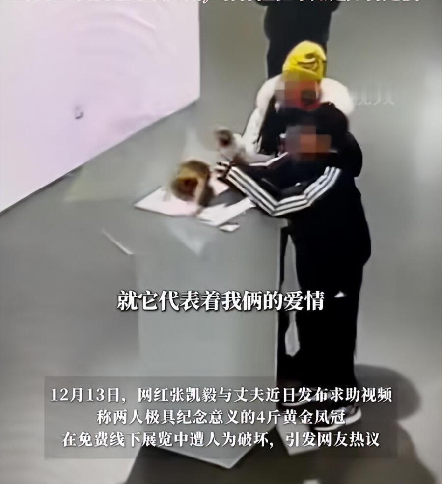 12月13日,千万粉丝博主张凯毅发视频说,丈夫为她亲手打造的4斤重黄金凤冠,在免费展览上被破坏了。这展是她和丈夫筹备的,收集很多艺术家作品,没要门票还请了保安、装了保护罩。可一男孩反复抱柜子、上手触碰,致凤冠和展罩掉落。 这凤冠可不一般,央美毕业的丈夫花3个月纯手工打造,镶着4克拉钻戒,按金价超130万,还有两人相识纪念日细节。摔后结构变形、装饰脱落,修复要半年还可能有永久损伤。 张凯毅没找家长索赔,走保险理赔流程。有人夸她大度,也有人觉得她纵容。只能说,线下看展真别用手乱碰啊!