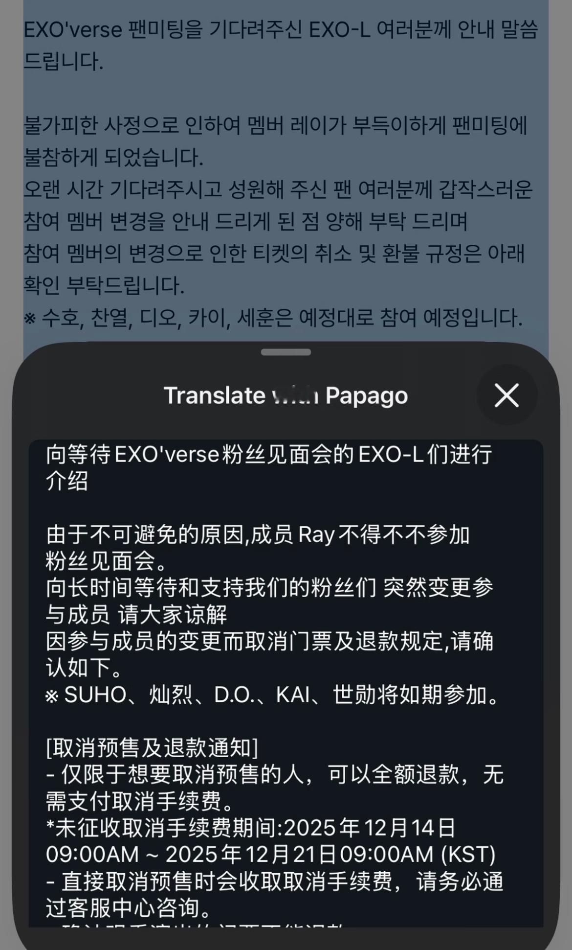 张艺兴不参加EXO见面会 因不可抗力因素,张艺兴将不参加EXO的粉丝见面会,请大家谅解。