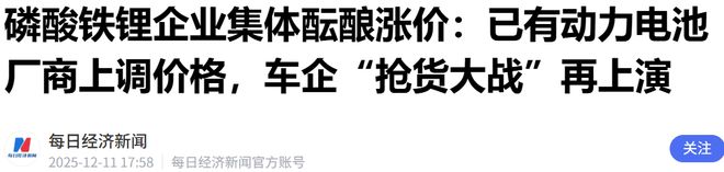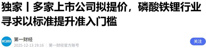 电动知家消息,12月13日,据第一财经等多家媒体报道,磷酸铁锂行业迎来涨价潮,多家上市公司拟调价应对亏损困局。这一轮价格调整背后,是磷酸铁锂行业在连续三年普遍亏损后的自救行动。