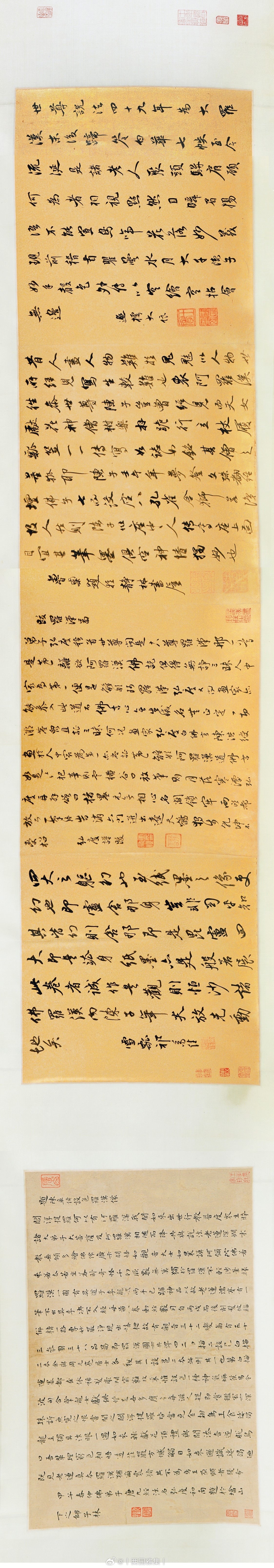 陈洪绶 释迦说法图 手卷 设色绢本题签:陈章侯龙王礼佛图卷。田溪书屋珍藏。钤印:何、冠五。题识:悔迟洪绶敬图。钤印:章侯鉴藏印:庐江、何冠五印、宝、冠五珍藏、第一稀有、田溪书屋鉴藏、冠五居士、冠五清赏、田溪书屋、冠五审定、春雷阁藏、震泽王氏季迁收藏印、怀云楼鉴赏书画之记、王季迁氏审定真迹、曾藏王季迁处、天壤至宝、王氏季迁珍藏之印、季迁珍藏、王季迁家珍藏题跋:1.世尊说法,四十九年,为大罗汉,末后蹄筌。白华七帙,至今流涎。是诸老人,聚头骈肩,顾何为者?相视默然,目瞬眉扬,语不能宣。鸟啼花落,妙义现前。稽首瞿昙,水月大千;陈子妙手,声色外传,以空绘空,拈会无边。遯樗大俍。钤印:王亹、王氏予安。2.昔人画人物,难于鬼魅。以人物世所经见,写生较难也。众阿罗汉往参世尊,陈子岂曾经见?而天女献花、神僧拊乐、拜跪行立,杖履瓢笠,一一传写,如志如铭,其僧之董狐耶?陈子壬午年梦登文殊,翻经坛佛子七,而设座八。孔雀金狮,若识故人。然则,陈子以座中人,传写座上面目,宜其笔墨俱空,神情独妙也。鲁㮚题于静林书屋。钤印:鲁㮚之印、韦菴。3.跋罗汉图。弟子弘度稽首世尊问:是十八尊罗汉,那一尊是第一离欲阿罗汉?佛说:但得无诤三昧,人中最为第一,便是离欲阿罗汉。弘度又问:画家亦能参入此道不?佛言:心无生灭,名无正定,一切微尘众,且证三昧,何况画家?弘度白佛言:陈洪绶画于人中最为第一,亦应记第一离欲阿罗汉道。佛言:如是!如是!把笔则云横谷口,放笔则月落寒潭。弘度再拜颂曰:楮墨元无相,心名关锁牢。两头都放下,一笔片时消。 六门迸出辽天鹤,独步乾坤不受招。弘度谨跋。钤印:唐九经印、豫公。4.四大之躯,幻也;至纸墨之像,更幻也。即卢舍那身,岂非幻乎?知其皆幻,则舍那即是毗卢,四大即是法身,纸墨亦是般若。展此卷者,诚作是观,则恒沙诸佛罗汉,向陈子笔尖放光动地矣。雪瓢祁豸佳。钤印:祁豸佳印。5.题陈章侯设色罗汉像。阎浮提罗,何以有阿罗汉?我闻:如来出世行教,普度众生时,诸大弟子、大菩萨及阿罗汉相随而降,共与说法。老莲深悯末教垂倾,多绘佛像,广示开悟。如观音大士、如曩谟阿弥陀佛,若来若去,若坐若卧,奇怪千幻,厥数无算。独于罗汉,不轻涉笔。缘罗汉一图,有吴道子、李龙眠两手,已踞神品。以故老莲濡毫,有一笔不出吴、李,决不入纸。每图一卷,动经数月。自丙戌(1646)而后,削发披缁,并精一路,专妙严净,现出诸相。故有观音三十二变图、有五十三参图、三十八品图。即罗汉图,亦共得四:二白描,二设色。白描二本,余与周元亮居士各获其一;设色二本,此则其一也。第白描运墨,都在依稀发豪间,最难收采;惟设色一种,神气焕发,易令波旬合掌,龙女献供。惟是世多膺本,每滋人疑,即赏鉴家,亦深珠诉鱼冤之恨。尝闻之,阎浮提罗皆当克金翅鸟王,食娑竭。龙主独具法眼,一遇如来辄献花顶礼,与闻法音,遂脱鸟口。吾辈理穷色相,悟透庄严,方憾触目。如来逊识娑竭,迺既见老莲真本罗汉,犹尔怀猜。其不为鸟王朵颐者,几希!甲午(1654)春仲,佛弟子唐九经法名弘度和南题于墖山下之师子林。钤印:九经、豫公、詹詹西。尺寸:画心33×398cm;题跋①29.5×126cm;②29.5×45.5cm来源:保利2025秋拍《仰之弥高—古代书画夜场》