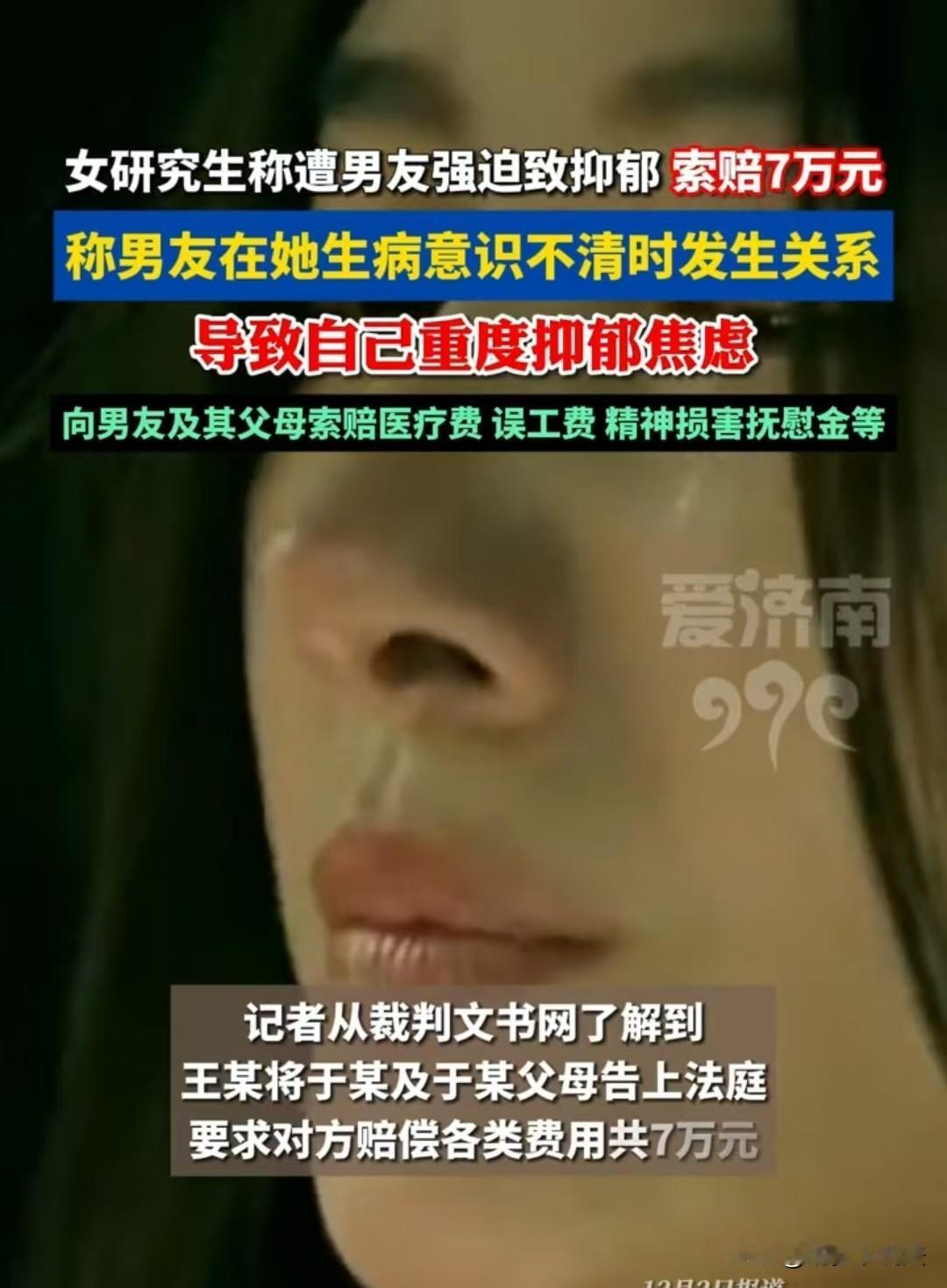 济南,女孩是研究生,在生病期间遭到男友冒犯,之后被诊断为重度抑郁。她要求对方赔偿