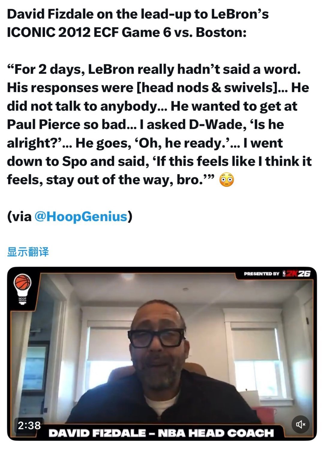 死亡之瞳!前热火队助理教练菲兹代尔谈詹姆斯2012年东决G6的经典之战:“输掉第五场比赛后整整两天,勒布朗几乎一言不发,回应方式只有点头和转头。他不和任何人交流,一心想要好好教训皮尔斯。我问韦德,‘他没事吧?’,韦德说‘他已经准备好了’。我随后找到斯波尔斯特拉,对他说‘如果情况和我预想的一样,那咱们就别插手了,兄弟。’”