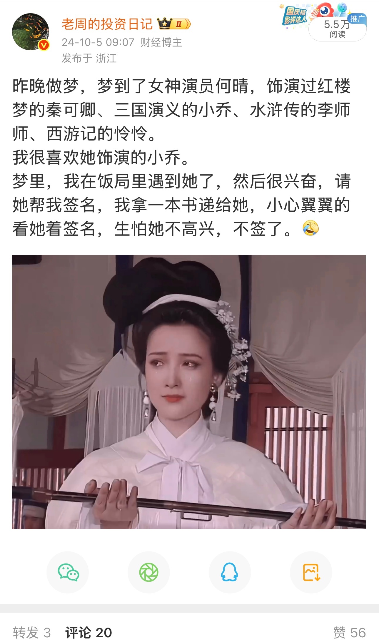 演员何晴去世女神何晴去世,晴天霹雳,在我心里,她还没老呢。几年前看过她一个专访,状态很好,红颜薄命,愿女神一路走好。我手机相册上一直保存着何晴饰演小乔的这张动图,是所有女演员里最美的图。我2024年曾经梦到过何晴一次,梦里,我在饭局里遇到她了,然后很兴奋,请她帮我签名,我拿一本书递给她,小心翼翼的看她着签名,生怕她不高兴,不签了。