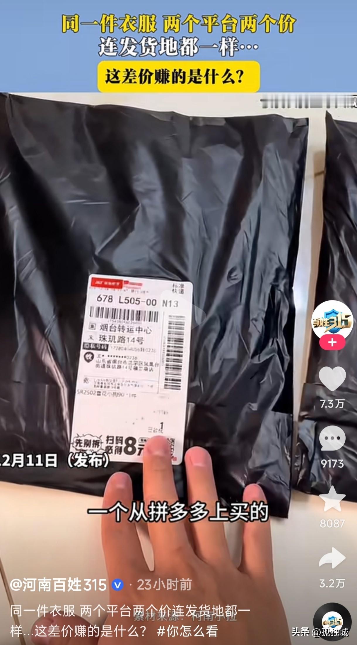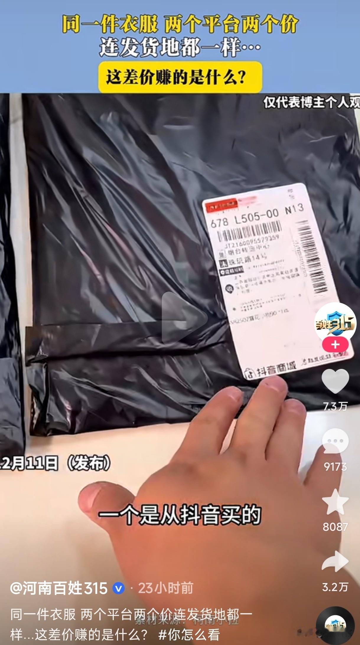 有没有做电商的行家说说这差价赚的是什么? 男子在抖音和拼多多买了同一件衣服,抖音34块,拼多多25块,而且还是同一个发货地址,并且布料的内衬也是一模一样。 为什么相同的一件衣服,两个平台购买价格不相同也可以理解,但它为什么会是同一个发货地址呢?难道每个平台都是这样赚差价的吗?为什么抖音和拼多多的区别会如此之大?是不是拼多多上面的东西便宜,它是直接从仓库发货的吗?抖音上面的东西比拼多多上面的贵,它又是二手贩子从中赚取差价吗? 如果都是这样赚差价的话,那京东和淘宝上面的东西岂不是也一样了?京东专送的服务态度那可是一流的快,难道这就是所谓的快有快的道理?贵有贵的价值吗?大平台价格高就是如此由来的吗? 我就不信所有的电商平台都是如此?有没有行家来说说是不是这样?