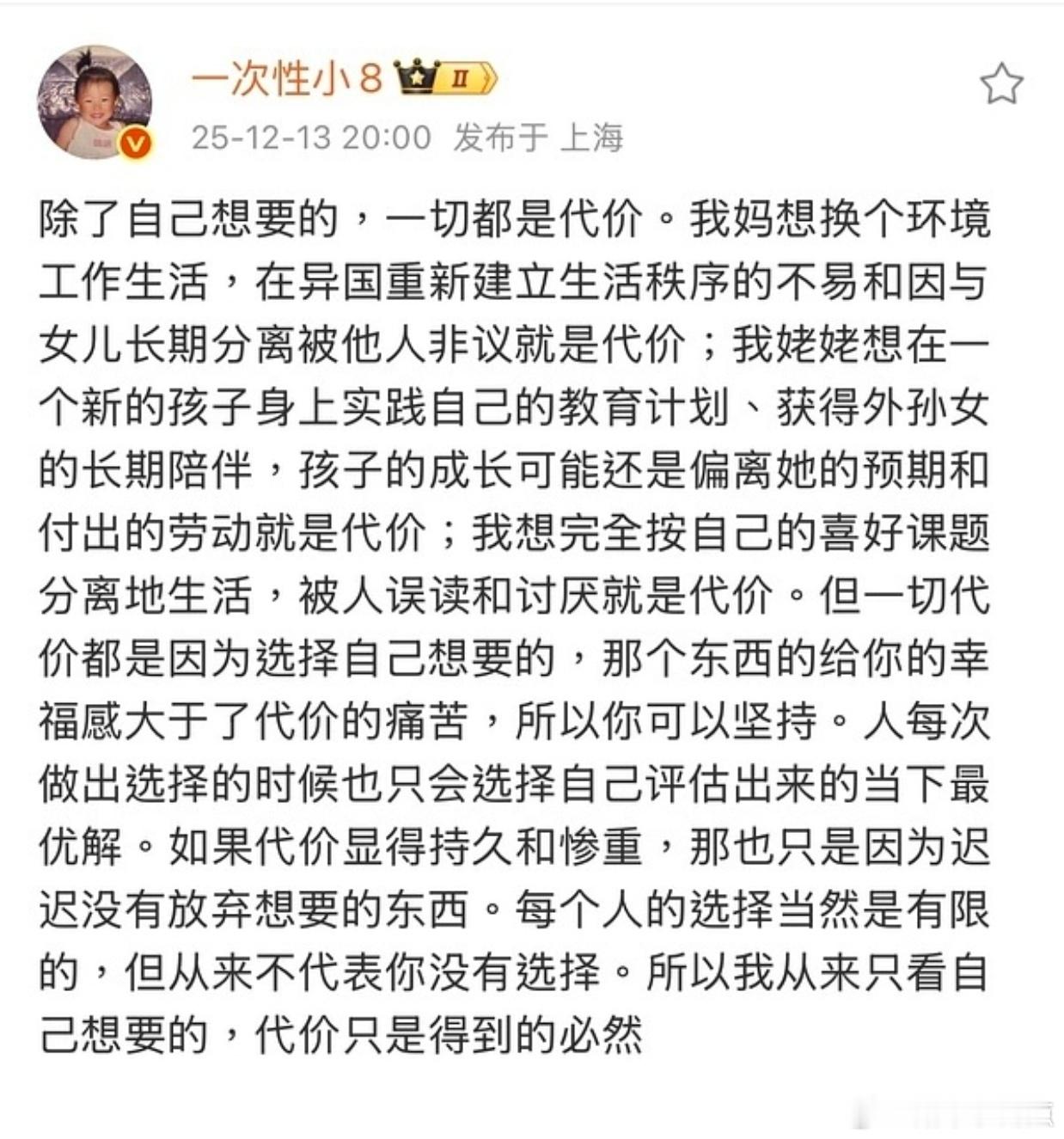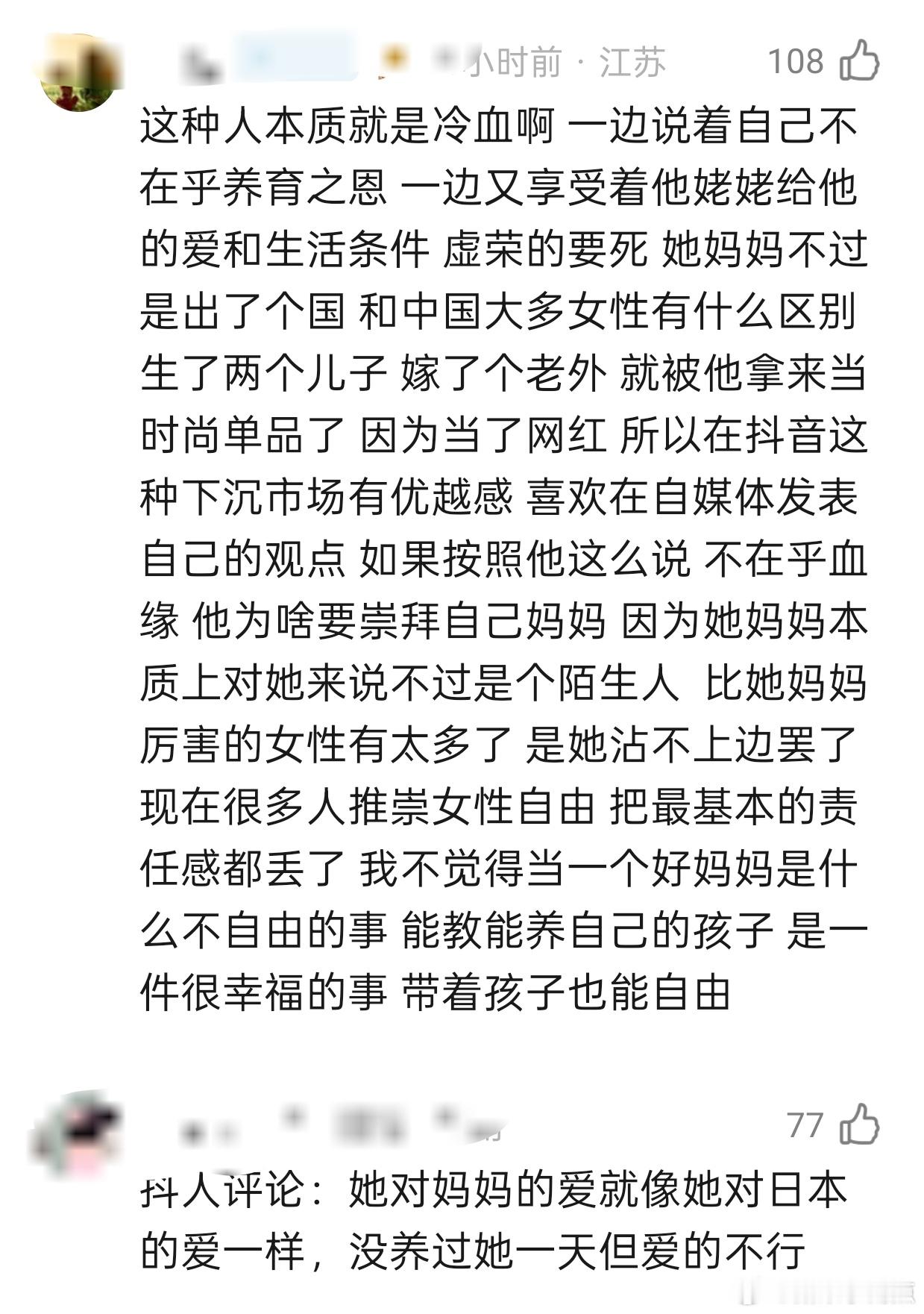 这个王悦伊为啥对从小抚养她长大的姥姥这么刻薄啊?对它不管不顾的妈妈连声赞美,姥姥抚养她几十年是理所应当,甚至认为姥姥嫉妒它和它的妈妈。在姥姥走以后还能说出这么薄情的话,这是人干的事吗?抖人评价:它对它妈的爱就像对小日子的爱一样,没养过它一条但爱的不行……