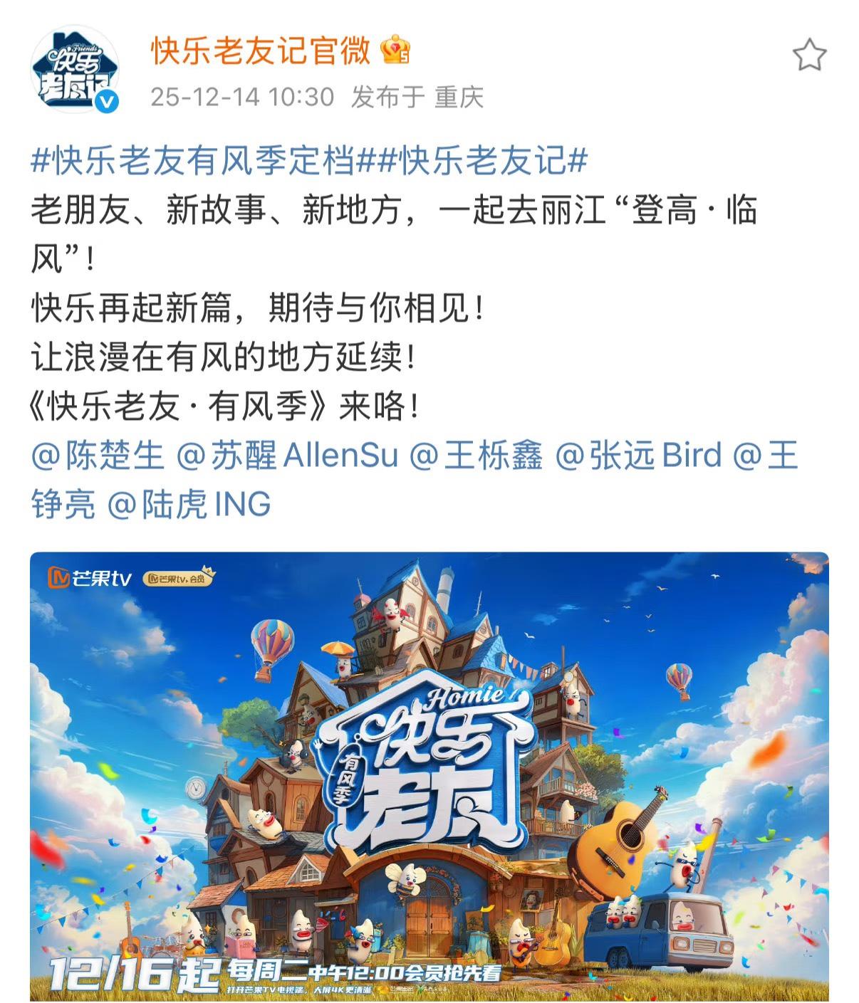 啊啊!周二空降快乐老友记3! 下周二哥几个就要回来了,快乐也就随之一起来了。 看来把这个综艺放周二也是🈶足够的底气,因为不怕没有收视率。 🈶一个细节,@哥几个的时候完全按排名来,笑死😂这刻进DNA的排名。