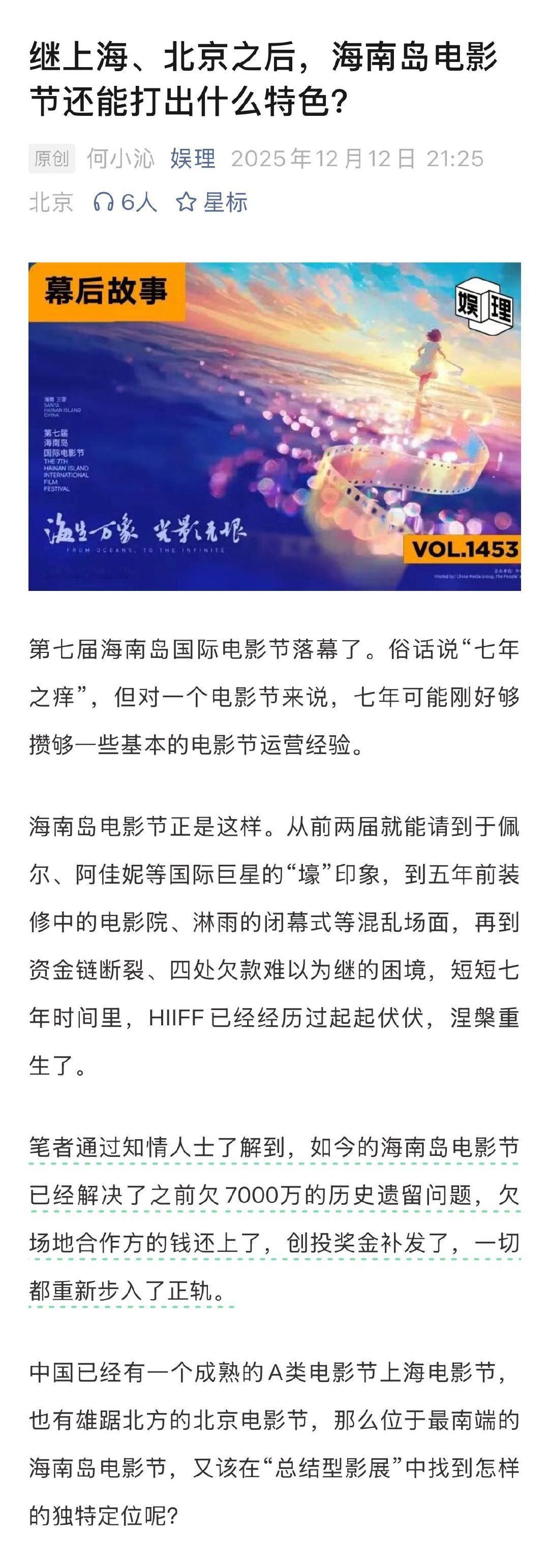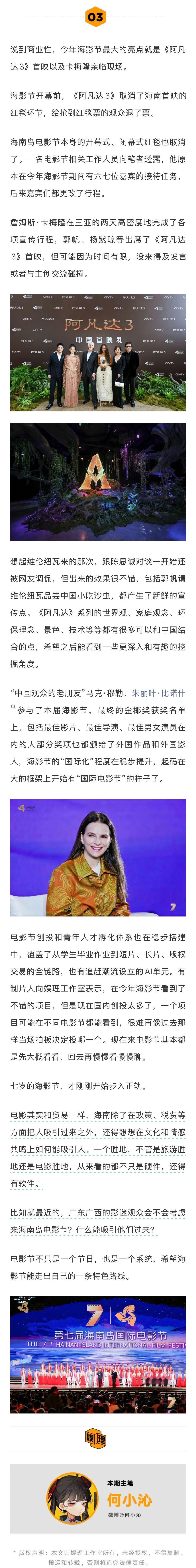 海南岛电影节正在步入正轨 今年的海南岛电影节有哪些变化 在看来,海南除了在政策、税费等方面把人吸引过来外,还得想想在文化和情感共鸣上如何能吸引人。一个胜地,不管是旅游胜地还是电影胜地,从来看的都不只是硬件,还得有软件。电影节不只是一个节日,也是一个系统,希望海影节能走出自己的一条特色路线…娱理独家↓
