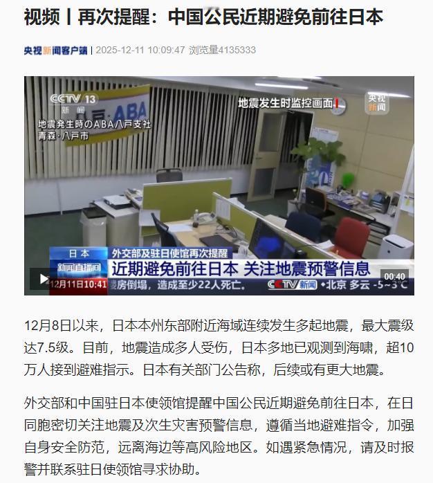 外交部再发赴日旅行警告,驻日使馆开放公民登记,网友:大的要来了? 12月10号,外交部和咱们驻日本的使馆,又发了赴日旅行提醒,叫大家最近别去日本;还特意提醒在日本的同胞,赶紧用手机APP或者小程序登记下自己的信息,这样使馆就能随时找到人、提供帮忙。 本来这俩都是针对日本地震的常规安全提醒,可巧了,最近中日关系有点僵,不少网友就瞎琢磨了,说“地震就是个借口,中国这是对日本没耐心了,要动手了”。 再一看到辽宁舰在日本东边海里训练、中俄一起巡航绕了日本半圈的新闻,更有人拍板说“这下要出大事了”。 说实话,大家关心国家、担心在日本的同胞安全,这心情我能理解,可要是把这几件事往一块儿凑、瞎联想,那就错了。今天我就用最直白的话,跟大伙把这事讲明白。 首先得说清楚,外交部发旅行警告,从来都是因为真有安全风险,不是随便发的,更不会拿地震当借口。 这次日本的地震真不是小事,12月8号深夜青森以东就震了一次,没过几天12号上午,本州东部和青森以东又接连发生6.8级、6.7级强震,日本都发了海啸预警,说最大浪高能到1米,东北沿海和北海道都得小心。 日本本身就在地震带上,连续强震后,再来大余震或新强震的概率很高,外交部反复提醒,就是怕同胞在那出事,这种提醒是国际上的常规做法,有明确的规矩。 而且这种提醒不是第一次了,之前2011年日本3·11大地震、2015年尼泊尔大地震、2023年土耳其大地震时,咱们都第一时间发了旅行警告,还让当地同胞登记信息,之后组织撤侨。 就说2011年日本地震,当时靠登记信息,咱们顺利把上万名同胞接回了国,这些都是公开可查的事,从来没跟“政治施压”“要动手”扯上过关系,核心就一个:保护在外同胞的命。 再说让在日同胞登记信息这事,更是常规操作,跟“动手”半点关系没有。咱们国家在海外有几百万同胞,一旦当地出事,使馆要第一时间找到人帮忙,前提就是得知道谁在哪。 2022年乌克兰局势紧张时,也是先让同胞登记,再有序撤侨,最后几千人都安全回来了。 所以登记信息就是给海外同胞织一张“安全网”,方便出事时精准救助,不是要撤侨,更不是要动手的信号。 至于大家关心的辽宁舰训练和中俄联合巡航,也别跟旅行警告绑在一起想。 中俄联合巡航是早就定好的年度计划,从2019年开始每年都搞,现在都成常态了,就像咱们每年固定和朋友一起锻炼一样,是正常的军事合作,目的是维护地区和平。 每次都明确说不针对第三国,这次国防部也回应了,就是年度计划内的事,跟日本地震、旅行警告没关系。 辽宁舰在日本东侧海域训练也一样,是常规的军事训练。根据日本方面的消息,辽宁舰是沿琉球群岛以东海域北上练舰载机飞行,这是海军正常的战备训练,符合国际规矩。 咱们的航母编队远海训练早就常态化了,目的是提升维护国家主权的能力,不针对任何国家。 要是真有别的想法,哪会光明正大地让外界知道?这种公开的训练,恰恰说明是常规操作,没什么好过度解读的。 有人可能会说,中日关系紧张是事实,难道一点关联都没有?确实近期中日有分歧,但咱们国家处理事有原则,绝不会把保护同胞和政治分歧混为一谈。 不管国际局势怎么变,先保同胞安全是第一位的,这次就算中日有摩擦,看到日本地震风险高,还是会提醒同胞避险、登记信息,这是大国的担当,不是什么信号。 其实网友觉得“大的要来了”,就是把几件事硬绑在了一起。国家每一项举措都有明确目的:发旅行警告是看灾害风险,搞军事训练是为了国防需求,让登记信息是为了同胞安全,这几件事各有各的道理,不能因为赶在一块就瞎联想。 就像家里买灭火器不是要着火了,是防火灾;提醒家人出门小心,不是怕有人针对,是防意外,国家做这些事,跟咱们保护家人的心情一样,都是为了防范风险。 最后跟大伙说句实在的,关心国家大事是好事,但得凭事实理性看,别被不实猜测带偏。 这次发警告、让登记,就是因为日本地震危险,怕同胞出事;军事训练是常规操作,跟“动手”没关系。 在日同胞赶紧登记信息,咱们普通人不信谣、不传谣,理性关注就行,这就是对国家最好的支持。
