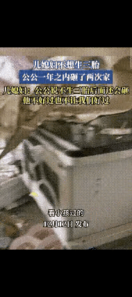 公公催儿媳“生二胎”,被拒后把家“砸了”,甚至还威胁儿媳,砸到同意生为止! 儿媳因为不愿意生二胎,公公直接把她家给砸的稀烂,屋里的东西被摔得乱七八糟。更让儿媳窒息的是,这已经是公公一年当中第二次这么做了,还对她撂下狠话,只要她不答应生二胎,就会一直砸下去。 儿媳看着被砸得一片狼藉的屋子,被砸毁的家,说自己心里好难过,看着小孩儿过的好了,又让自己生。 好好的日子,因为生二胎的事被搅得鸡犬不宁,连个安稳的日子都没有。 婆家对生娃想法 儿媳纠纷 生二胎 公公