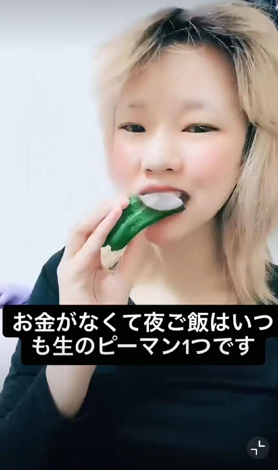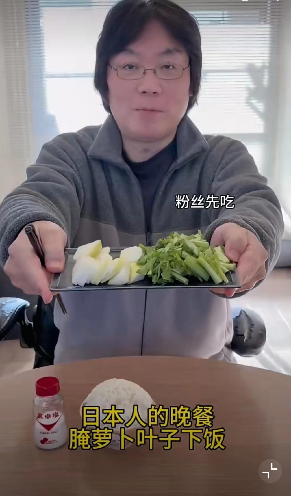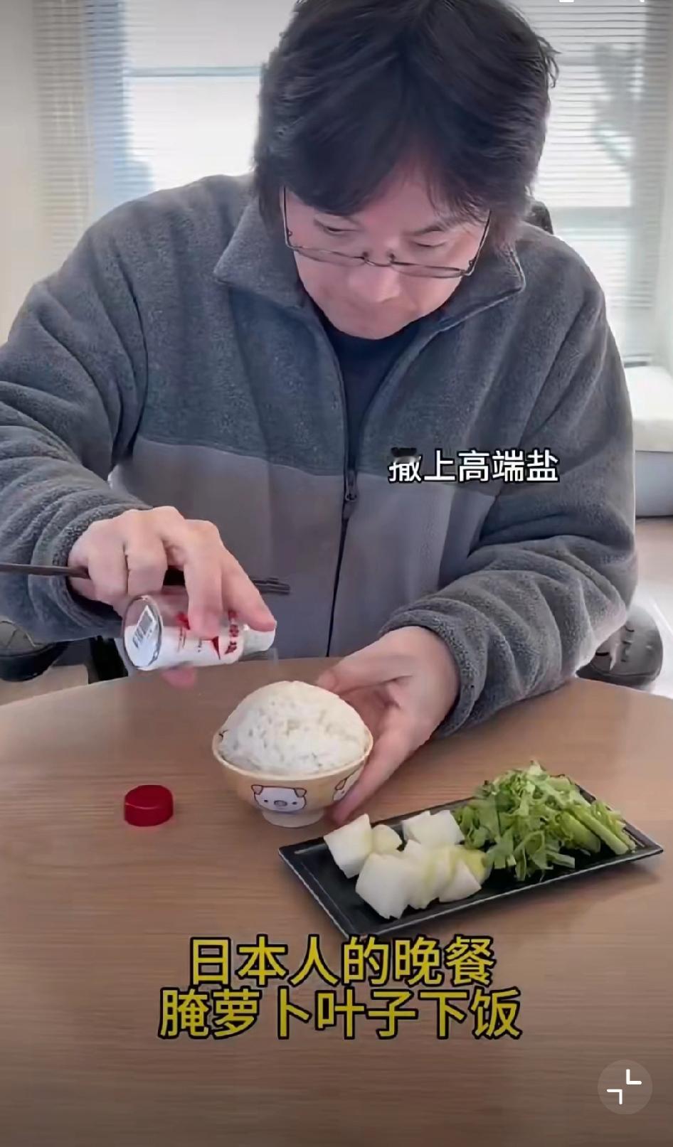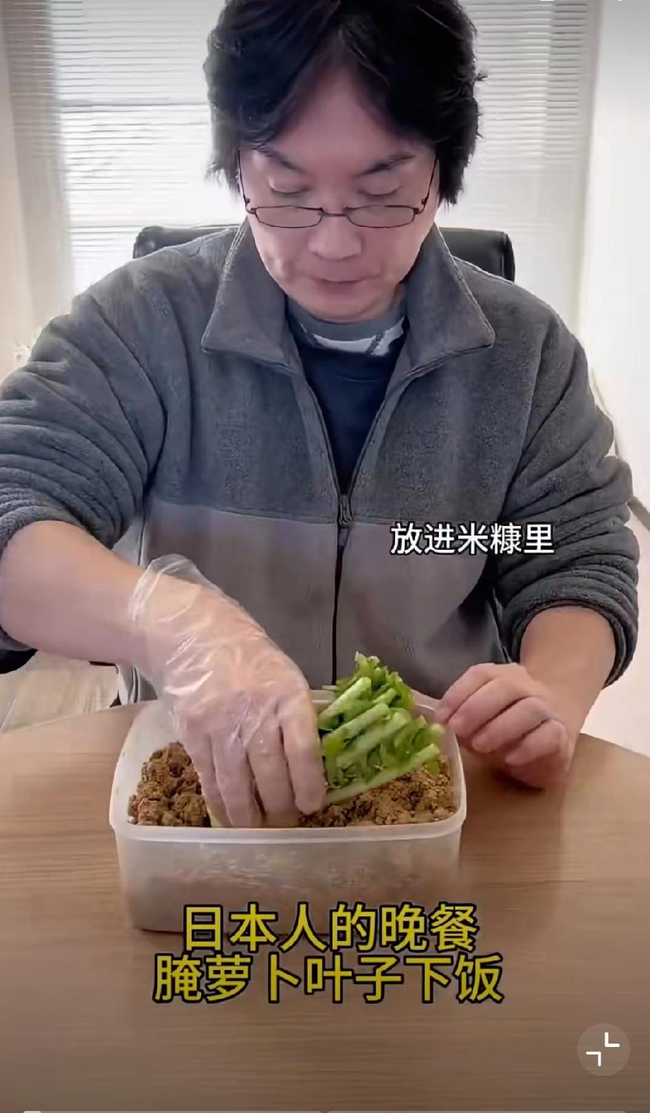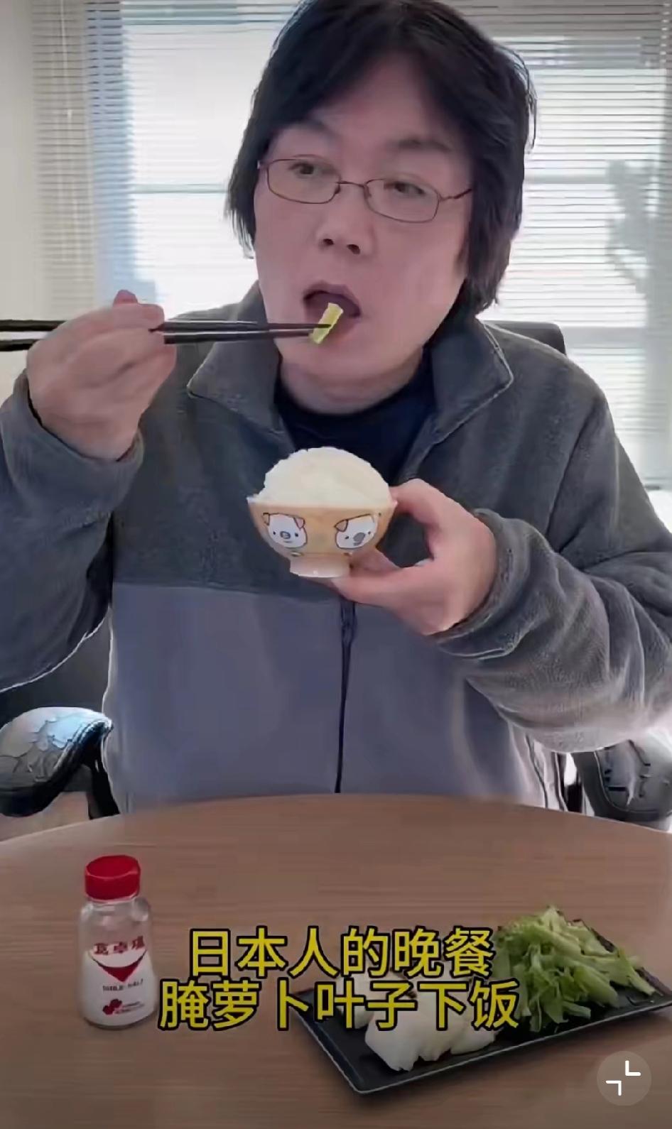 又来围观日本人吃晚餐。 一个白萝卜,先切下一截,然后放在米糠里,盖上盖子,放冰箱里冷藏12个小时。吃晚饭时,把米糠里的萝卜切片,然后奉上“请粉丝先吃”。米饭上撒点盐,然后就开吃。 这人还是不够生活化,傻啊,要是把萝卜蒂种在盆栽里,长出新的萝卜叶,每天一瓣菜叶,那就不用再买菜了啊。 另一个日本女子直接生吃青椒,可能里面有奶酪吗?这女的比那70多岁的老太太吃冰镇青椒强。 这种要是放在国内,配上“我们都在用力的活着”的BGM,闻者落泪,听者伤心,关爱和捐款滚滚而来。