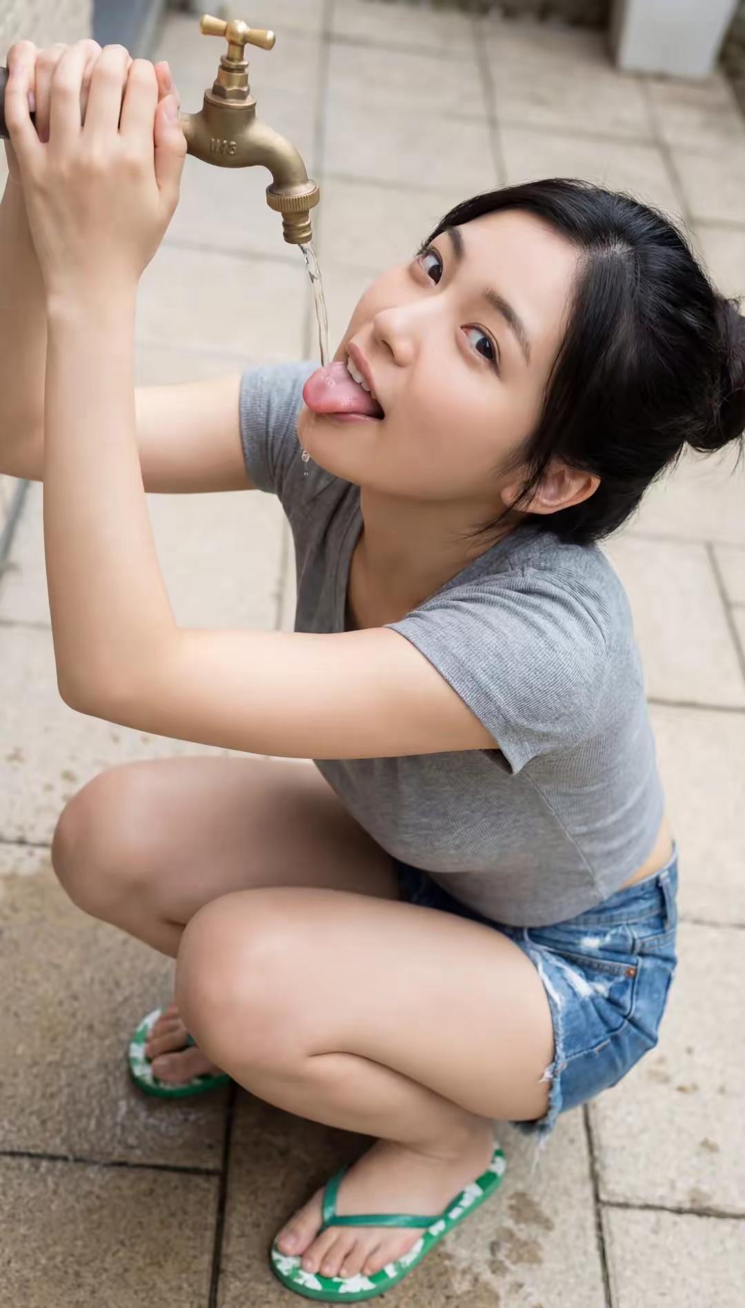 女孩在户外玩水,吐舌头扮鬼脸。玩水的搞笑女 甩舌头变妆特效 耍舌变装