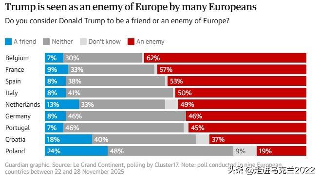 一半的欧洲人认为,特朗普是欧洲的敌人 据不久前的一项民调显示,近一半的欧洲人(48%的受访者)认为美国总统特朗普是“欧洲的敌人”。《卫报》报道。 对特朗普的态度: 根据一项在九个欧洲国家进行的研究结果,近48%的受访者称,特朗普为公开敌对的人物。 按国别分类,持这样看法的受访者: 比利时(62%)和法国(57%)记录到最高,最低的是克罗地亚(37%)和波兰(19%)。 研究人员指出,“特朗普主义”作为威胁的认知,正在增长,而将其视为中立立场的人数,相比2024年底有所减少。 尽管如此,欧洲人仍然认识到,与美国关系的重要性:近一半的受访者(48%)认为,欧盟应在与华盛顿的关系中选择妥协立场。 在调查与俄罗斯开战的风险时,受访者态度显示: 51%的受访者认为,未来几年与俄罗斯公开开战的风险很高,18%认为风险非常高。大多数恐惧发生在波兰,占77%。 作为对比,法国这一比例为54%,德国为51%,葡萄牙为39%,意大利为34%。 对本国防御能力的不信任: 在防御能力方面,脆弱感同样存在: 69%的调查参与者认为,其国家尚未做好充分准备来抵御可能的侵略。 法国人信心最高——44%,但这仍是少数。在波兰,58%的人表达了对国防能力的不信任。 由于威胁范围广泛——从军事、能源到技术——只有12%的受访者表示自己并不觉得特别危险。 最常见的担心是数字和技术安全(28%)以及军事威胁(25%)。同时,69%的受访者预计,欧盟会发挥积极的保护作用。 欧盟支持依然很高: 支持欧盟成员资格的比例始终保持高水平:74%的受访者希望其国家留在欧盟。 支持者最多的是葡萄牙(90%)和西班牙(89%),波兰(68%)和法国(61%)是最少的。 脱欧: 脱欧五年后,多数人认为,英国的决定是错误的,大多数欧洲人认为,英国脱欧是一个负面决定:63%受访者认为,这对国家造成了伤害,只有19%认为是积极的。