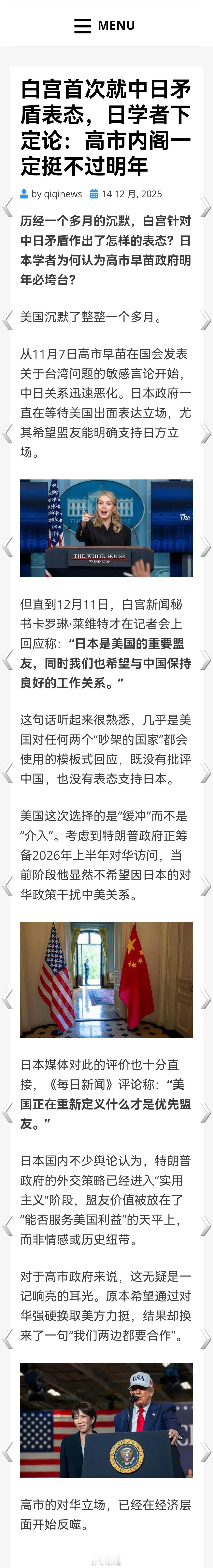 白宫首次就中日矛盾表态,日学者下定论:高市内阁一定挺不过明年!何天恩日本开始军事介入南海海外新鲜事