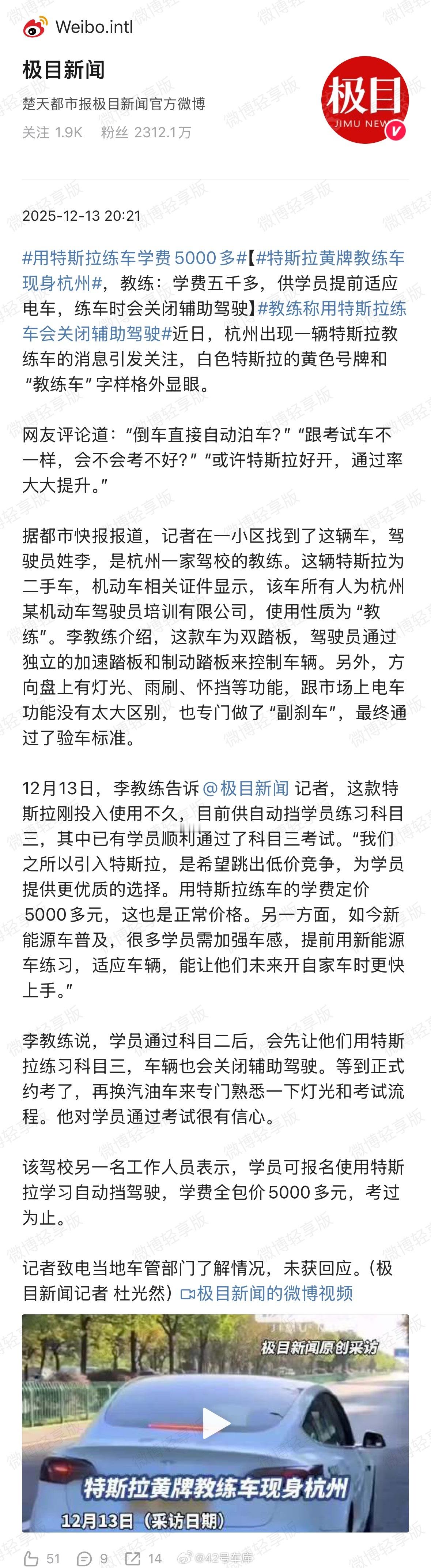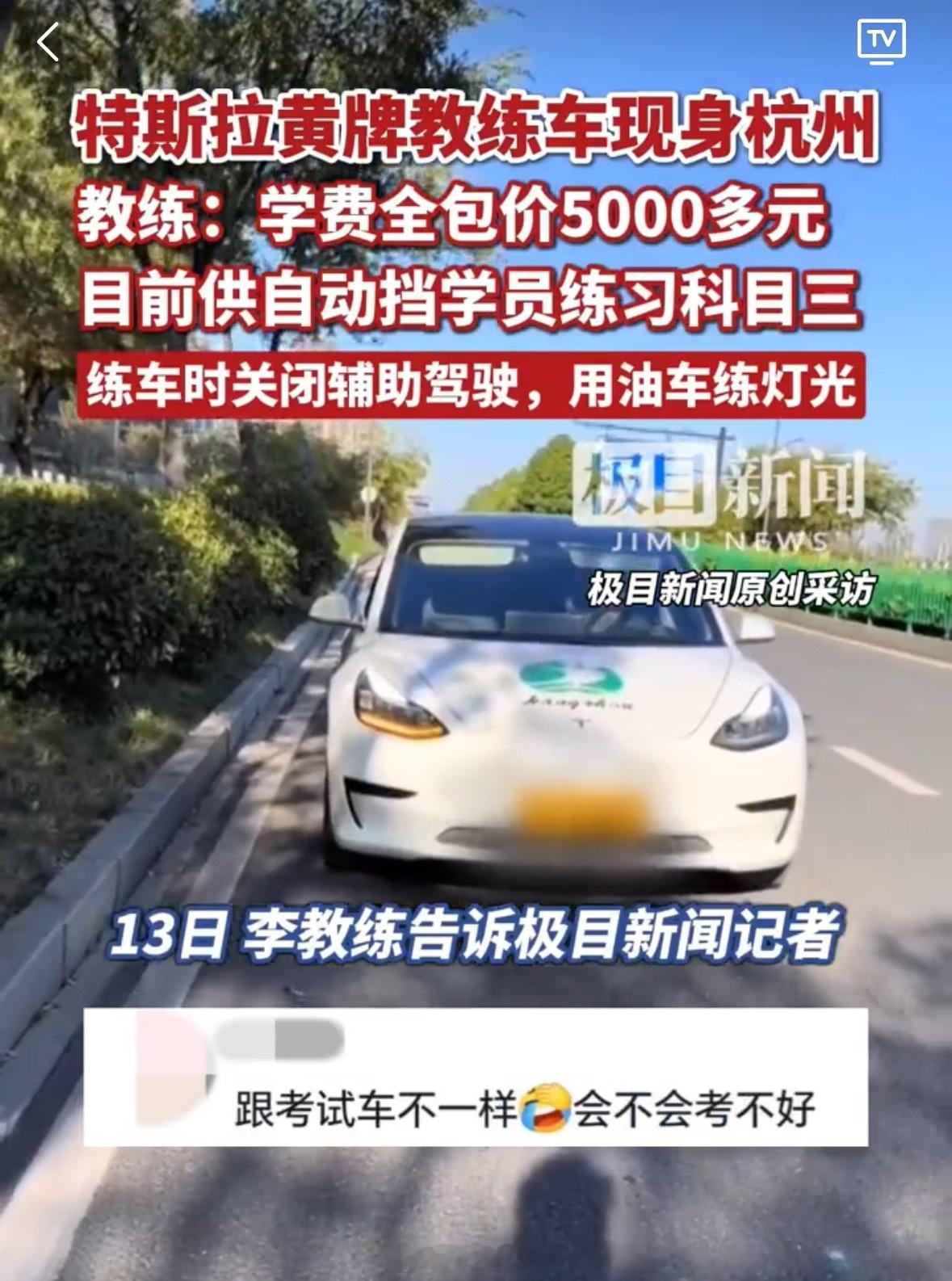 用特斯拉练车学费5000多 看视频是辆老款 Model 3,不练单踏板,还加了副刹车。教练解释说「提前用新能源车练习,能让他们开未来自家车时上手更快」,不过练灯光时还要换油车你觉得到了用特斯拉当教练车的时候了吗?42how特斯拉