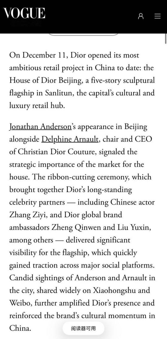 Vogue官网报道北京迪奥之家开幕活动:global ambassador刘雨昕参与剪彩。