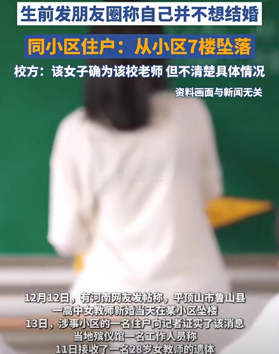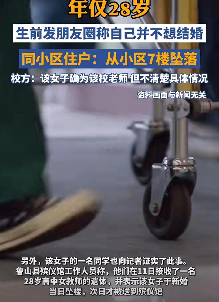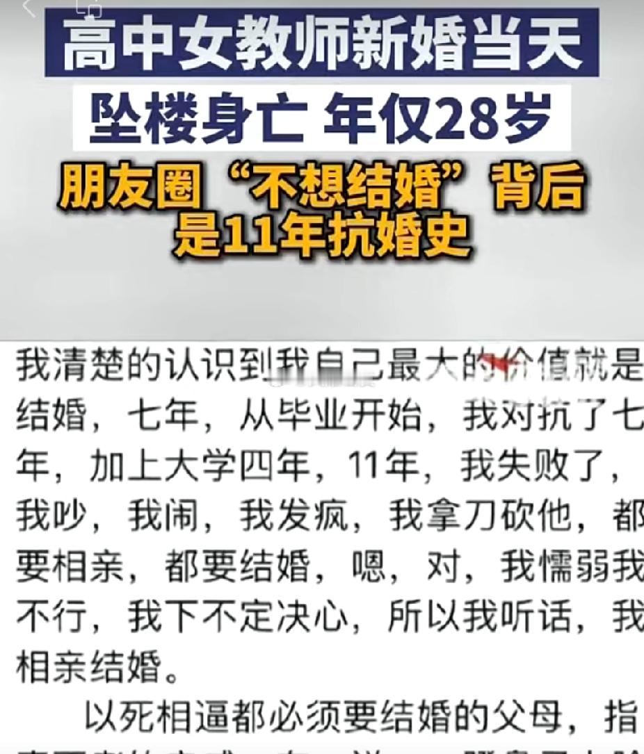高中女教师新婚当天坠楼身亡 惋惜!河南一名28岁的高中女教师在新婚当天坠楼身亡,11年的抗争与妥协最终未能阻止这场悲剧的发生。婚礼本应是幸福的开始,却成了她生命的终点,实在令人扼腕痛心。据报道,这位生前有稳定编制、性格善良的女教师,在长达11年的时间里,一直承受着来自家庭催婚的巨大压力。从大学到工作,她曾用争吵、哭闹等多种方式进行反抗。然而在家人眼中,“结婚”似乎成为了衡量她人生价值的标尺。最终,她似乎被迫妥协,接受了来自父母和婆家的安排,却将自己推向了无法承受的深渊。事件中两家人的做法也让公众感到寒心,引发了广泛的同情与反思。校方回应女教师新婚当天坠楼身亡
