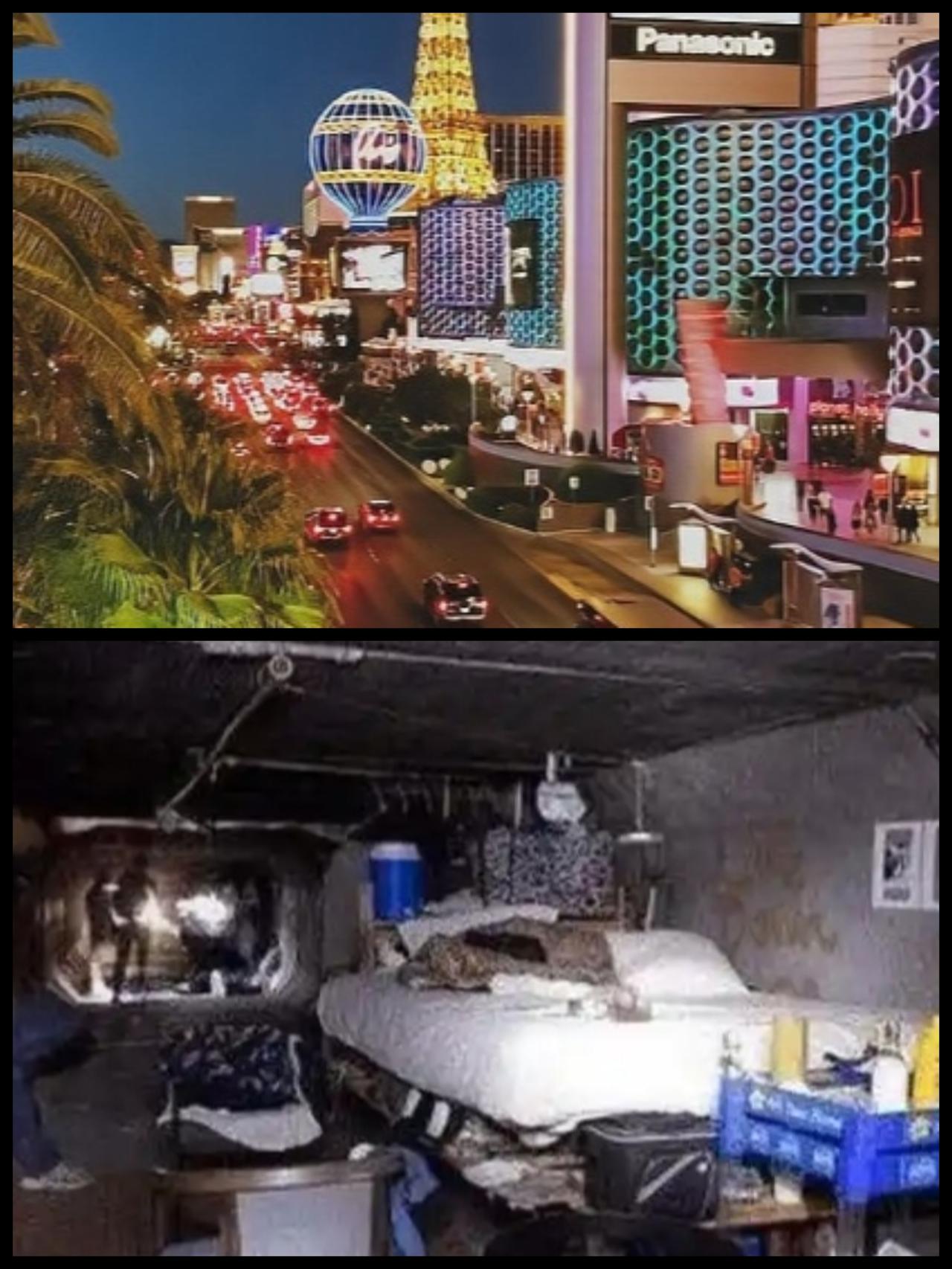 谁能想到,纸醉金迷的拉斯维加斯地下住着上千“鼹鼠人”,他们蜗居在废弃防洪隧道里,头顶就是灯红酒绿,醉生梦死的赌场。而这群人多为破产赌徒、瘾君子或流浪汉,因无法负担起高额的房租(月租1500美元起),而被迫躲进地下。隧道里没水没电,靠捡垃圾、乞讨度日,而地面上的法律禁止流浪汉露宿,逼得他们只能选择这个潮湿、危险的“家”。