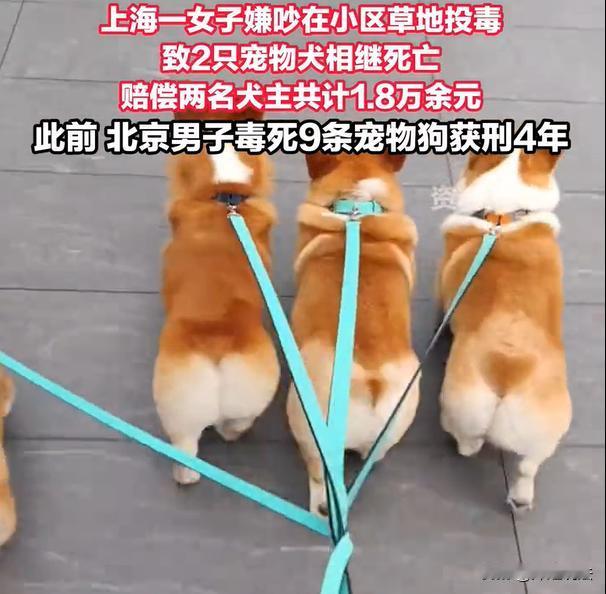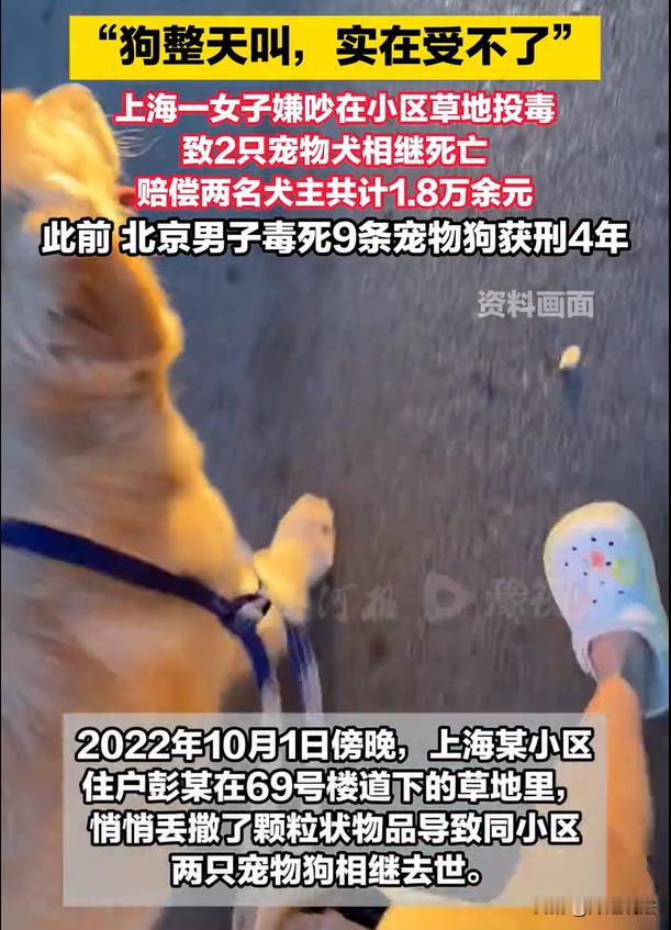 上海,一女子小区楼洞里,有不少居民喜欢饲养宠物,女子受不了楼道里小狗的叫闹声,就去购买了颗粒状的药物,回来直接丢在老小区的草地里。没多久,就有两只宠物狗吃下去毒发身亡。狗主人发现草地里遗留了不少药物,通过监控查询,就是本楼栋内的一名女住户所为。后来,狗主人上诉,要求女子做出赔偿。 大河报12月13日报道了这则新闻。经过调查之后处理决定,要求女子赔偿两位狗主人合计1.8万元,两只去世的犬只属于名贵宠物狗,价值较高。 家住某小区的彭某,小区内有不少住户喜欢养宠物狗,文明养狗也是无可厚非,但是彭某生性并不是很喜欢狗,加上这些小狗还非常吵闹。 不管是白天还是晚上,一有点动静,楼栋里的小狗们就开始大声吵闹。一只狗叫了,另外的小狗们,全都跟着开始大声吵闹。 “谁家狗在叫啊,不能管管啊!这些狗子整天叫唤,我真的是受不了啦!”对此彭某也经常去投诉,想让小区物业多多管理这些养狗者们。 但是物业工作人员去管理之后,狗主人们也承认会文明养狗。但是小狗又不是人类,它并不能完全听话,也不受管。每天不管什么时间,这些狗子就又开始“汪汪汪”大叫。 这样的生活,彭某也是受够了。每天就是听到狗狗们的叫声,让她无法静心生活,彭某想到了一个恶毒的方式——解决掉它们。 彭某去店里购买了专门毒狗的药品,呈现出颗粒状,伴随香味,能够吸引路过的狗狗们来说食用。买回来之后,彭某将将物品撒到草地里。 没多久,就看到草地里倒着两条宠物犬。经过了解,这是两户人家饲养的名贵犬只。两位狗主人发现草地里存在这些颗粒物,心想,这些肯定是有毒的。 经过检测之后发现,这些确实是专门用来毒狗的物品。调查监控之后,发现这些物质是居民彭某所为,是她故意往草地里投掷这些毒物。 痛失爱犬,而且还有人在小区投毒,两位狗主人决定把彭某给上诉了。经过调查之后发现,彭某对于自己的行为也供认不讳,最后判决彭某需要赔偿两位狗主人合计1.8万元损失金额。 同样的案件,前阵子也在北京上演。当时一位名叫张某的嫌疑人,毒害了9只宠物犬。其中一位狗主人也是受害人,她决定上诉,只想严惩张某。 经过时间的沉淀,宠物狗主人一直在搜集资料、替爱犬维权,张某因为涉嫌在公共场所投放危险物质,最后被判处4年有期徒刑。 在小区公共场所投放危险物品毒杀宠物狗,行为人将会面临怎样的法律惩处呢? 第一、行为人可能涉嫌故意投毒罪。 根据《刑法》规定,在小区等公共场所投毒,如毒害宠物狗,行为人可能构成投放危险物质罪,会面临三年以上、十年以下有期徒刑。如果造成严重后果,如导致人员伤亡或者重大财产损失,刑期可能会升至十年以上、甚至死刑。 彭某故意在小区内的草地里,投放危险物质。小区的草地是公共区域,路过的不仅是犬只,还有人类包括老人小孩,彭某的行为非常危险、也不够理性,后期肯定是会面临刑事判刑。 第二、行为人可能构成故意损坏财物罪。 根据法律规定,此举在于危害性,并非仅仅只是针对宠物本身。在公共空间,客观危险性已经构成犯罪,如果宠物的价值比较高,可能还触犯故意毁坏财物罪,行为人还需要做出民事赔偿。 彭某在公共场所,投放危险物质,此举存在的危害,并不只是针对不特定多数人的生命、健康和财产安全,不仅仅对宠物有存在危险,对于人类也会造成生命威胁。 因此,彭某的行为已经构成了投毒罪,此举已经构成犯罪,将要面临刑事判刑。虽然彭某自己也提出,也就是针对狗,并没有想要毒害他人。另外,犬只属于名贵犬种,损失较大,彭某还要做出经济赔偿、赔偿狗主人损失。 文明养犬、遵守社区规则,只要是喜欢小狗的,基本上都会遵守养狗条约。然而,可能还是有极个别的狗主人,可能会存在毁约的情况,因此就必然会导致一些养犬纠纷、引发不愉快事件。 对此,大家都怎么看呢?欢迎大家一起来说一说。