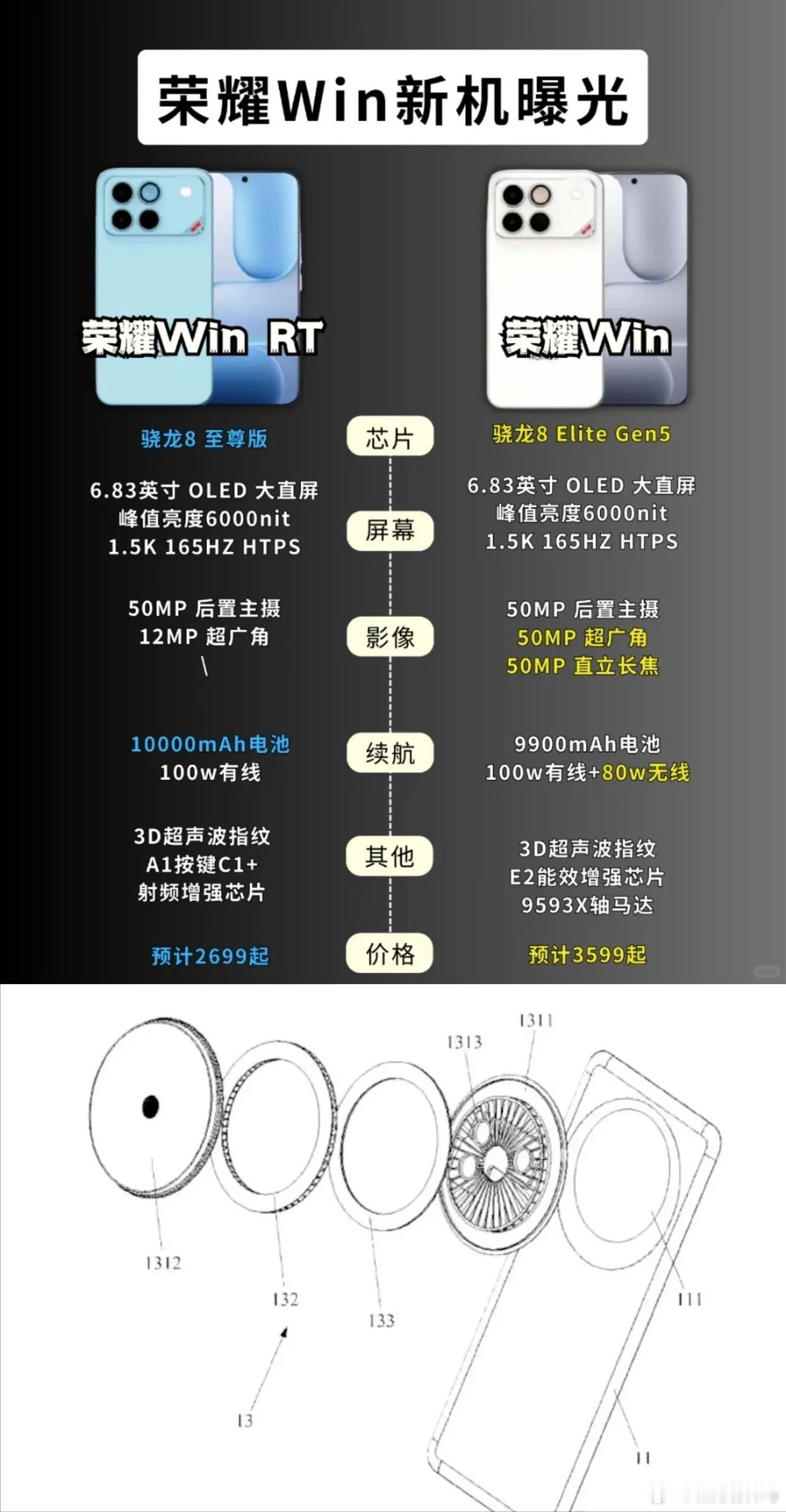 早就听说华为之前申请过手机风扇专利,本来以为Mate80系列会先用上这黑科技,结果全系都没搭载,还挺意外的。现在荣耀WIN系列曝光了,不光性能比预想的还顶,居然配了9000毫安的大电池,最关键的是真内置了风扇!跟之前网上传的一样,这风扇被荣耀藏在镜头模组里,不仔细看根本发现不了,技术思路看着和华为那套挺像的,估计余承东也没想到荣耀能把这专利落地用上。