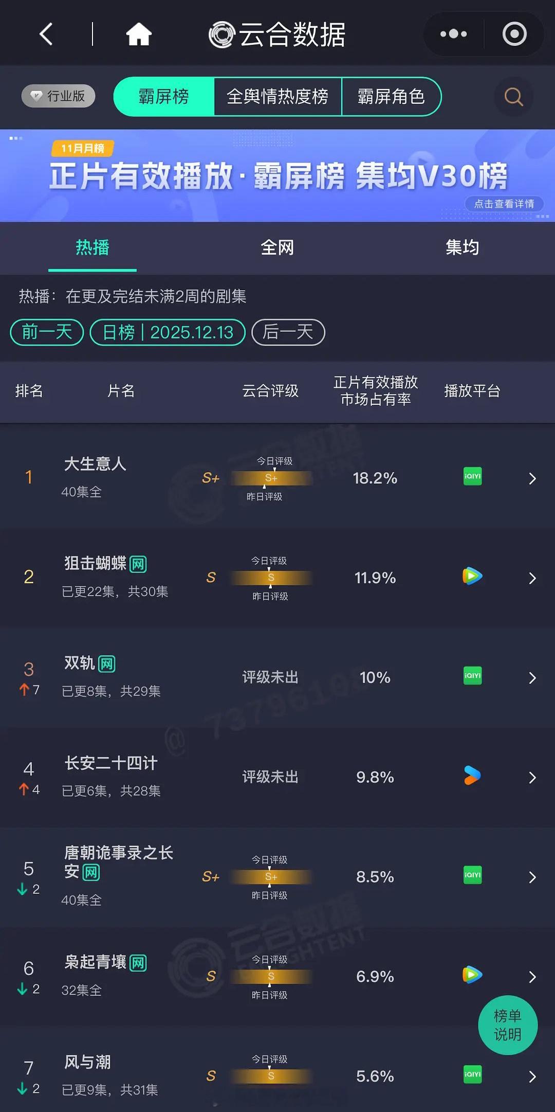 12.13 云合🈶大生意人18.2% 狙击蝴蝶11.9% 双轨10% 二十四计9.8%风与潮5.6%