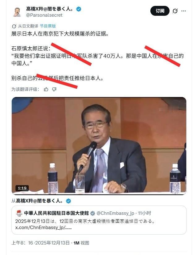 在铁的证据面前,小日子还在否认南京大屠杀,一个小日子今天转发中国驻日本大使馆的帖子,引用石原慎太郎的话,否认侵华日军进行南京大屠杀,并试图栽赃中国军队。 这个帖子得到了数万小日子的转评赞,评论区的小日子们都在极力否认南京大屠杀的存在。热点观点南京大屠杀唯一存世动态影像