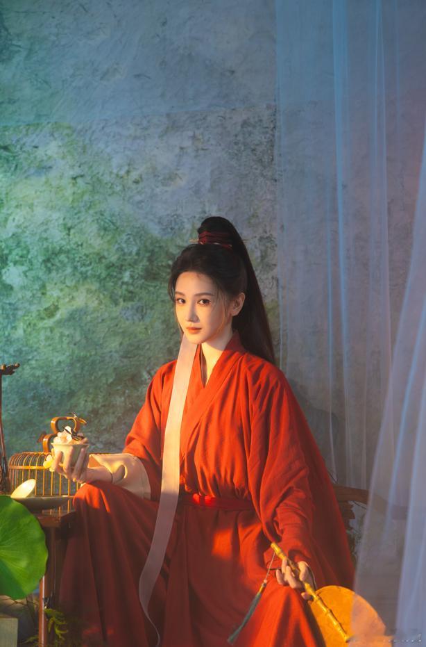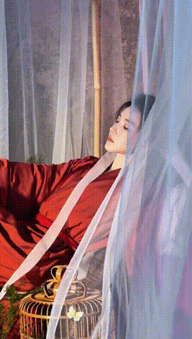 陈小纭身上的诡魅感陈小纭的古风造型呈现 “红男绿女” 的鲜明反差,红衣男装带着明显刚气,青绿纱裙女装透着诡魅的柔和,两种风格衔接流畅,也暗合了 “蝴蝶不是笼中物” 的深层寓意。