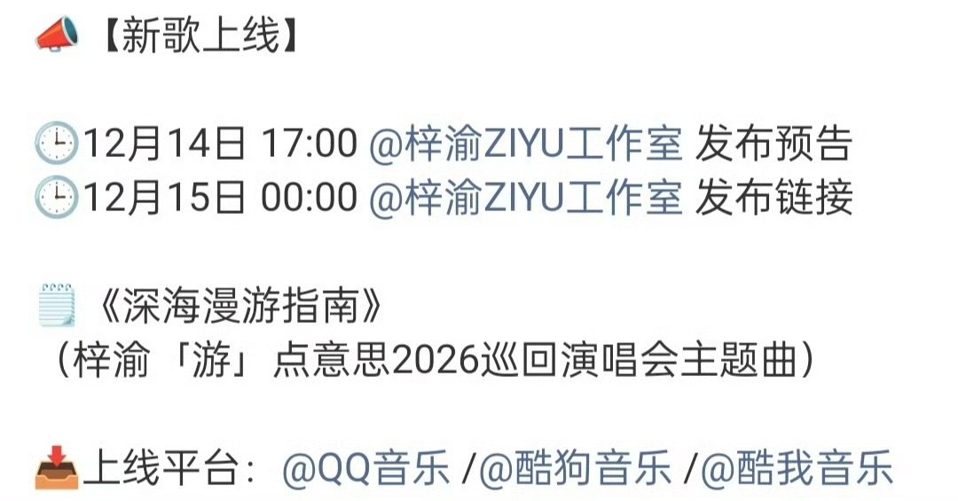 梓渝2026巡回演唱会主题曲梓渝深海漫游指南新歌预告梓渝《深海漫游指南》新歌预告游点意思2026巡回演唱会主题曲