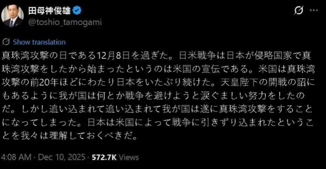 突发特讯!开始对美国“开火”了,日本极右翼分子通告全球,珍珠港事件,是美国对日本的栽赃抹黑,罕见措辞引爆国际舆论。 12 月 7 日,美国还在社交媒体上哭祭珍珠港 84 周年的亡魂,三天后,日本前航空自卫队头头田母神俊雄,直接在网上掀了桌子:“别装了!珍珠港就是美国给日本下的套,我们当年是被逼无奈才还手!” 这话一喊,全球网友都看傻了。一个手上沾着侵略污点的极右翼分子,居然敢指着 “盟友” 的鼻子翻旧账?更讽刺的是,喊出这话的田母神,不是街头瞎侃的小混混 — 他跟日本首相高市早苗是铁哥们,还是推动 “修宪扩军” 的急先锋,这波操作根本不是一时冲动,是憋着劲儿要把黑的说成白的。 先说这桩 84 年前的旧案,到底谁在装糊涂。1941 年的日本,早把中国东北变成了 “提款机”,又一路南下啃东南亚,手脚伸得比谁都长。美国看不过眼,掐了日本的石油命脉 — 这就成了田母神嘴里的 “战略围堵”。可他绝口不提,日本当时的石油,八成是用来造坦克飞机打侵略战的。 更可笑的是 “被逼反击” 的鬼话。1941 年 11 月,日本天皇都拍板要打美国了,驻美大使还在华盛顿跟美国务院喝茶谈和平。一边是外交官笑脸相迎,一边是联合舰队从单冠湾悄悄出发,全程关了无线电,像幽灵似的往珍珠港摸。飞行员在战机上写着 “此生不归”,东京的报纸却天天登 “和平谈判进展顺利”。 最绝的是那份 “最后通牒”。日本给美国的宣战书,故意拖到偷袭开始后一小时才送达。等美国人拆开电报,珍珠港的战舰已经炸成了火球,2403 名美国士兵沉到了海底。这哪是 “反击”?分明是蓄谋已久的背后捅刀,连起码的战场规矩都不讲。 田母神敢这么嚣张,不是他记性差,是背后有人撑腰。他所在的 “日本会议”,是日本极右翼的核心圈子,高市早苗就是这个圈子的头面人物。这些人多年来就没闲着:改教科书把 “侵略中国” 改成 “进出中国”,首相带头去靖国神社拜战犯,现在又把防卫预算提到 GDP 的 2%,比德国还高。 要扩军,就得先洗白历史。把珍珠港说成 “美国设套”,就是为了把日本从 “侵略者” 包装成 “受害者”。这样一来,造导弹、买战机就有了 “正当理由”— 你看,当年我们是被逼的,现在得早点准备。这套把戏,跟二战前日本军部的套路一模一样。 而美国的反应,更透着一股 “揣着明白装糊涂” 的暧昧。白宫纪念珍珠港时,对日本的罪行轻描淡写,只说 “珍惜盟友关系”。为啥?为了在亚太围堵中国,得把日本当 “马前卒”。从冷战时减免日本战争赔偿,到现在默许日本修宪,美国一直拿历史正义换战略利益。 可这买卖,早晚会砸手里。田母神的话,其实是日本右翼对美国的 “敲山震虎”:你既然要靠我,就得认我的 “历史观”。现在他们敢否定珍珠港,下一步就敢说 “南京大屠杀是谎言”,再往后,说不定就敢重提 “大东亚共荣圈”。美国纵容的每一个谎言,都是在给太平洋埋炸弹。 太平洋底下,亚利桑那号的残骸还在渗油,像在哭那些枉死的人。而在亚洲,南京大屠杀的纪念馆里,累累白骨还在无声控诉;菲律宾的 “死亡行军” 遗址,每一块石头都记着日军的暴行。这些苦难,不是日本一句 “被逼的” 就能抹掉的。 现在的日本,一边抱着美国的大腿要武器,一边忙着洗白侵略历史;美国一边纪念自己的战争伤痛,一边对盟友的历史谎言视而不见。这对 “奇葩盟友”,把太平洋当成了算计利益的棋盘,却忘了历史的算盘从来不会错。