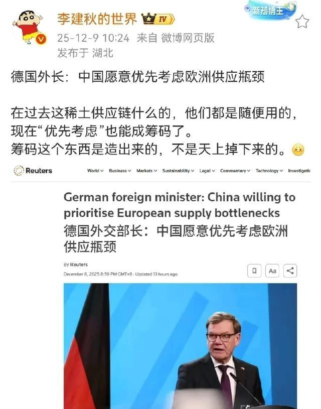 现在也让欧美尝尝什么是虚空造牌了,德国外长很快开心,说中国会优先考虑给欧洲供应瓶劲,应该就是汽车芯片供应和稀土供应了,因为荷兰抢安世半导体,所以我们暂停了汽车芯片的出口,还有稀土审批延缓,德国想要让我们优先考虑这些供应,那就得有所保证,甚至要拿东西来换的,这些牌都虚空造出来的,完全是跟对方学的 特朗普贸易战的本质是一种极限施压战术,他常在没有实质筹码时虚张声势。先威胁加征高关税,制造恐慌氛围,然后坐等对方让步。这种玩法在国际贸易中并不新鲜,但特朗普将其发挥到极致。2019年,他突然宣布将2000亿美元中国商品关税从10%提高到25%,迫使中方加速谈判。结果,美国获得了农产品采购承诺和中国知识产权保护承诺,而关税仅部分降低。 这样的交换让美国短期获利,但长期看,全球供应链重塑成本高昂。许多美国公司转移生产线到东南亚,增加了运营开支。中国企业则加速本土化,提升技术自给率。特朗普的策略暴露了贸易战的双刃剑效应,一方面刺激本土制造业回流,另一方面加剧通胀压力。欧洲国家观察到这一模式,开始调整对华政策,避免类似被动局面。特朗普的遗产在于重塑了国际贸易规则讨论,强调公平竞争而非单纯自由贸易。 2025年9月30日,荷兰政府援引货物可用性法案,对安世半导体实施行政干预。这家公司是中国闻泰科技的全资子公司,主要生产汽车用功率芯片。荷兰官员评估风险后,认为中国所有权可能导致技术外流,于是下令公司报告技术转移细节。安世在荷兰设有工厂,但大部分成品在中国东莞完成封装。10月4日,中国商务部发布出口管制公告,禁止安世中国子公司向国外出口成品元器件。 这一措施直接影响欧洲汽车制造商供应链。德国斯图加特等地的汽车工厂面临芯片短缺,生产线减速。同期,中国从4月起加强稀土出口许可制度,要求企业逐单申请审批。内蒙古包头等地的稀土加工企业处理海外订单时,审批时间延长,导致日本和欧洲企业等待超过一个月。稀土作为电动汽车和电子产品关键材料,供应延缓加剧了全球制造业不确定性。中国通过这些管制,回应了西方技术限制,维护了产业安全。 中国稀土出口管制于2025年10月9日正式实施,针对境外组织和个人出口特定物项需获得许可证。这项政策源于产业转型升级需求,旨在规范全球供应链。欧盟高度依赖中国稀土,占全球供应80%以上。管制后,欧洲企业报告生产延误,损失数百万欧元。德国汽车业特别受影响,因为稀土用于制造磁铁和电池。 欧盟推出RESourceEU计划,目标到2030年本土生产满足10%需求,回收达到25%。这一计划包括成立欧洲关键原材料中心,协调战略行动。欧洲公司开始重审供应链,加速去中国化进程,但短期内难以摆脱依赖。超过70%的欧企在过去两年面临类似危机,促使政府加大本土矿产开发投资。中国强调管制符合绿色发展趋势,并非针对特定国家。全球稀土市场价格波动增大,企业库存管理变得复杂。 12月8日,德国外长瓦德富尔访华,与中国官员会晤,焦点是供应链稳定。他表达了对稀土和芯片供应的关切,希望中国优先处理欧洲需求。中国商务部长王文涛回应,中方将建设性处理许可发放。瓦德富尔指出德国制造业依赖这些材料,呼吁消除不确定性。 中国代表强调,需要荷兰提供保证,如撤销对安世的行政令,并在技术合作上让步。这次会晤持续一天,双方讨论交换条件。中国通过制造谈判空间,类似于过去美国贸易战中的做法。先暂停供应制造压力,然后在对话中寻求互利。欧洲工业界担忧长期影响,推动欧盟加快多元化供应来源。中国稀土管制让西方国家反思依赖风险,促使更多投资本土资源开发。谈判中,德国强调经贸关系重要性,中国则维护出口规范。 安世半导体事件暴露了中欧贸易摩擦的核心问题。荷兰干预后,中国暂停芯片出口,导致欧洲汽车产量下降。宝马和大众等公司报告生产线中断,影响季度业绩。荷兰经济大臣卡雷曼斯承认低估中方反制力度,于11月19日宣布暂停行政令。 这一决定基于与中方建设性谈判,但争议未平。安世中国工厂逐步恢复发货,确保成熟制程芯片流动。事件中,美国暂停实施穿透规则一年,也缓解了部分压力。中国商务部重申,安世问题是荷兰不当干预引起,呼吁撤销行政令。欧洲媒体报道,此事可能成为中国对抗西方的筹码。全球芯片供应链重塑加速,企业寻求多源供应。荷兰议会质询大臣,承认决策有误。事件推动中荷对话,继续讨论技术合作细节。