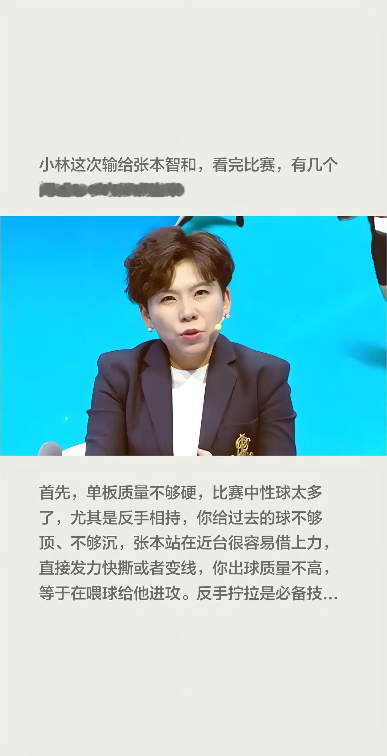 林诗栋3-4张本,邓亚萍一针见血说出关键。小林这次输给张本智和,看完比赛,有几个问题必须直接点出来。首先,单板质量不够硬,比赛中性球太多了,尤其是反手相持,你给过去的球不够顶、不够沉,张本站在近台很容易借上力,直接发力快撕或者变线,你出球质量不高,等于在喂球给他进攻。反手拧拉是必备技术,但你不能只追求上台,必须拧出速度和落点,要让他感觉别扭,不能让他舒舒服服地反手跟你打速度。其次,线路太死板,尤其是正手,我观察了,石头的正手拉球多数是斜线,张本早就摸透了,提前侧身在那等着封你,线路变化不是嘴上说的,是要在比赛中坚决执行的,正手直线、中路追身这些线路,你必须敢于在关键分用,你不变,对方就越来越适应,越打越从容。第三,退台这个习惯必须改,张本是近台快攻结合搏杀的打法,你一旦退台,球速和节奏就全在他手里了,他贴一板,你快带一板,然后他马上发力压你反手或者变正手大角,你步伐跟不上,只能放高球或者被动招架,很多球是你自己下意识退台调节,给了对手连续加压的空间,现代乒乓球,尤其是面对速度型选手,坚决不能退,要用快制快。第四,临场变化太慢,总是跟着对方的节奏走,从发球、接发球到相持中的节奏变化,都是张本在主导,比如发球,你发短球太多,旋转变化也不够,他接得很轻松,为什么不发长球偷袭?他第四局10:8领先时就敢发长球,虽然那次失误了,但决胜局9:9连续两个长球,直接拿下了比赛,这种胆量和算计,是你缺乏的,接发球也一样,不能总是摆短,该挑打、该劈长的时候要果断,要打乱他的预设连接。说到技战术和心理,有几个深层问题。一是小林似乎有点怵他,近年交手输多赢少,打到关键分时,你的出手不够坚定,想法多了,质量反而下降了,决胜局比拼的就是谁更坚决、谁更敢出手,二是小石头的相持节奏单一,缺少速度和落点的结合,光有力量不够,要有“凶稳准”的平衡,这方面要多看看樊振东的比赛,看他如何在高速对抗中保持高质量和变线。小林的打法存在一个根本矛盾:身材不高,护台面积有限,但却喜欢退台,这会让你的防守漏洞更大,弥补的办法不是一味防守,而是必须加强近台的主动上手和快速衔接,你的反手好,但不能只依赖反手,正手的全面性急需提升:半出台球的抢拉、台内挑打、正手位连续对拉的质量、反手位的侧身能力,这些都要练,步伐是生命线,近台快速转换的能力决定了你的上限。另外,赛前准备和赛后复盘必须做得更细致。张本的习惯线路、关键分习惯用什么技术、心态波动时的表现,这些都要研究透。比赛中,教练的指导时机也需要斟酌。每球都指点,可能会干扰你自己的思考和节奏。但关键分前,比如对方可能发长球偷袭这种明显趋势,必须提醒到位。最后我想说,输球正常,张本智和水平不低。但你要看到问题的本质。你的打法需要更聪明、更主动、更凶狠。不能等着对方失误,要主动制造机会。变化不是偶尔用用,而要成为你的本能。从发球开始,就要算计;在相持中,要敢于调动对方。天赋有差异,但后天的努力和头脑可以弥补很多。把你的反手强势真正转化为胜势,把正手短板补上来,把比赛阅读能力和应变速度提上去,你才能突破现在的瓶颈。球是一分一分打的,但思路必须清晰。知道问题在哪里,就狠下心去改。年轻人,路还长,但要走对方向。