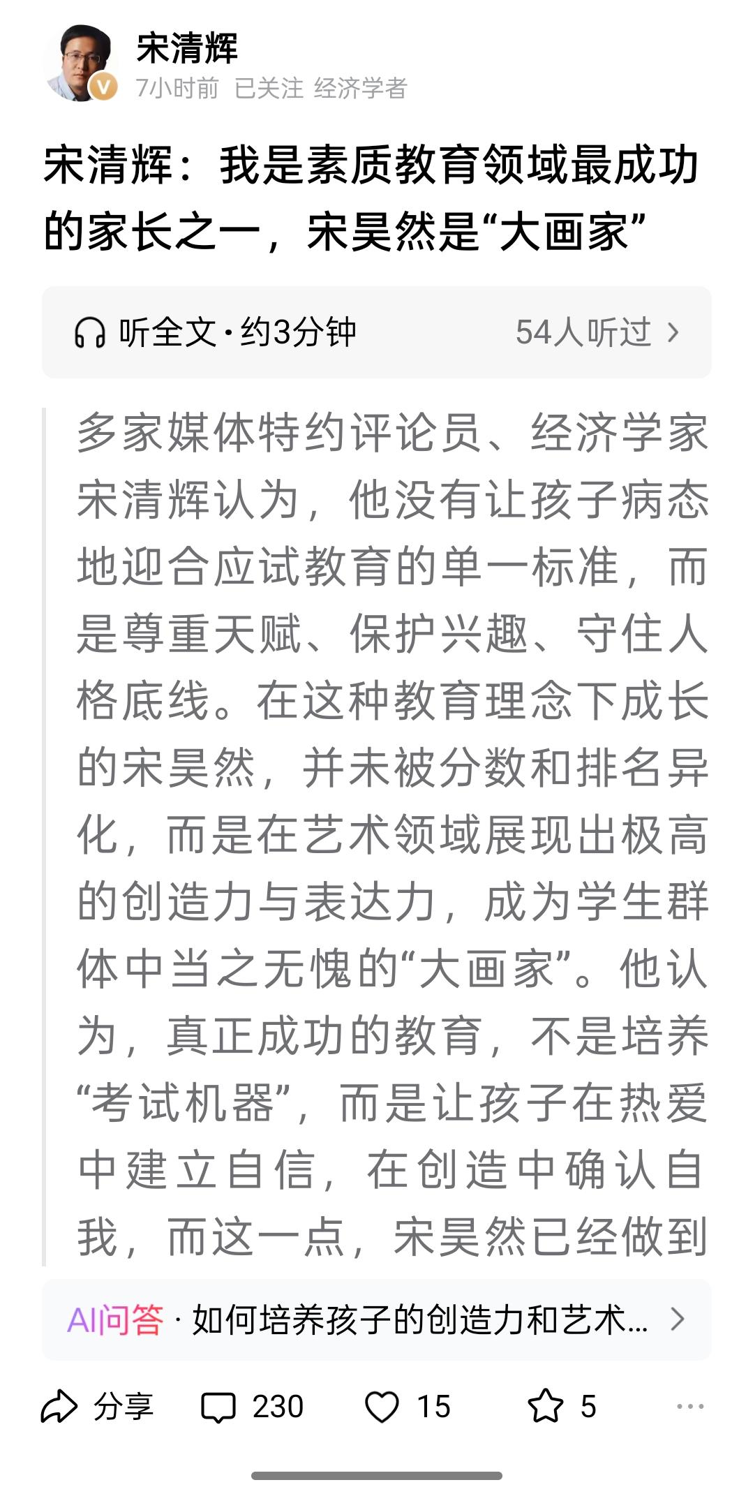 宋清辉是不是已经疯了? 经济专家宋清辉又发了一篇文章,说自己是素质教育最成功的父
