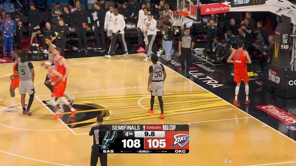 比赛不到10秒,马刺领先3分。雷霆球权,赢球?加时?