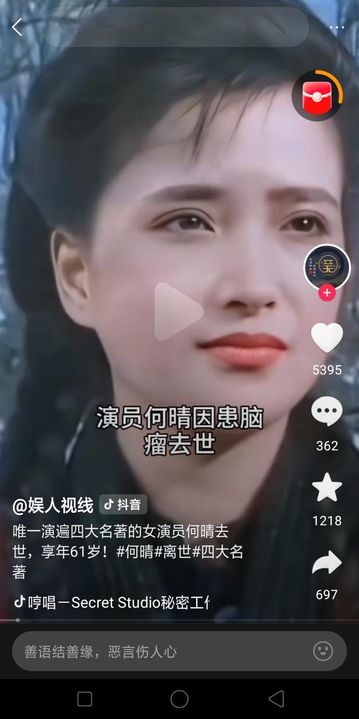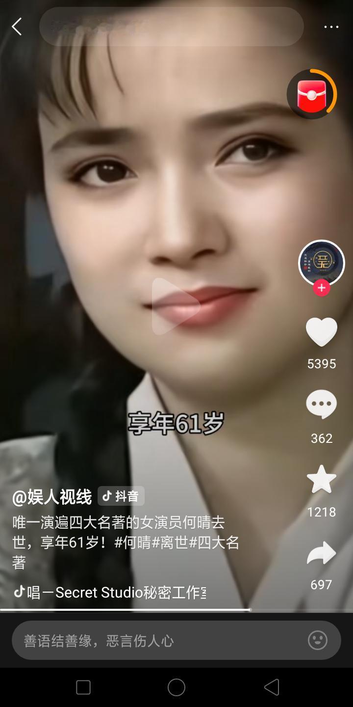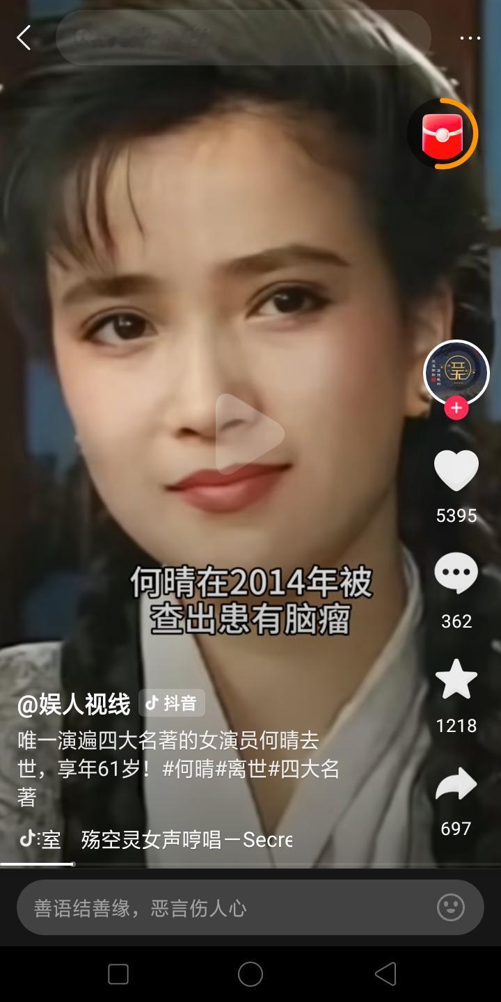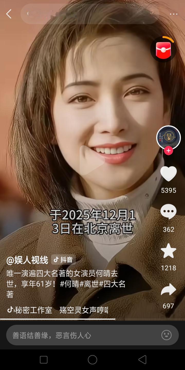 何晴说,我今年61岁了,于2025年12月13日去世了,真的很痛苦!虽然我演遍了四大名著,但是我真的很喜欢演戏! 我相信大家不知道何晴是谁,但是一看到她的相片,没有几个人不知道的,我们都是看她演的电视剧长大的!真的太可惜了啊! 这么美的女人,真的是天嫉红颜啊,这世上再无何晴了~
