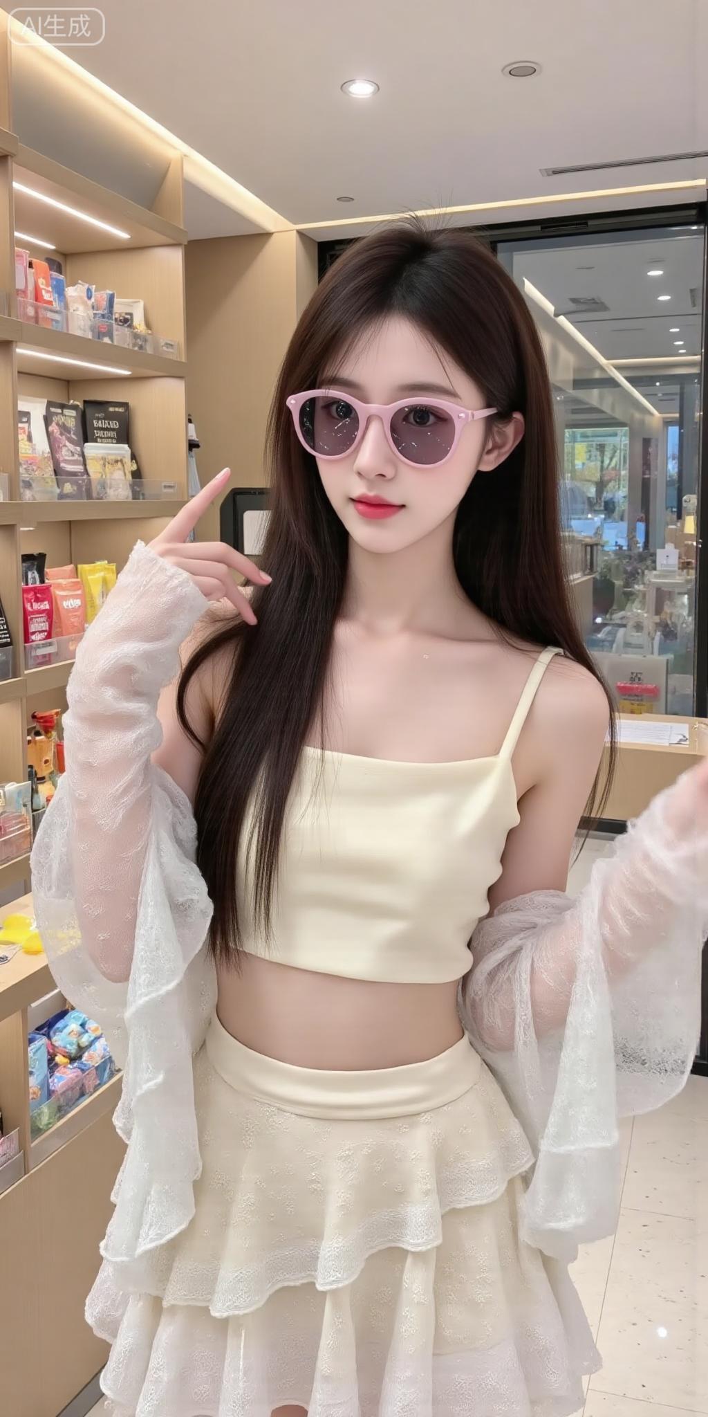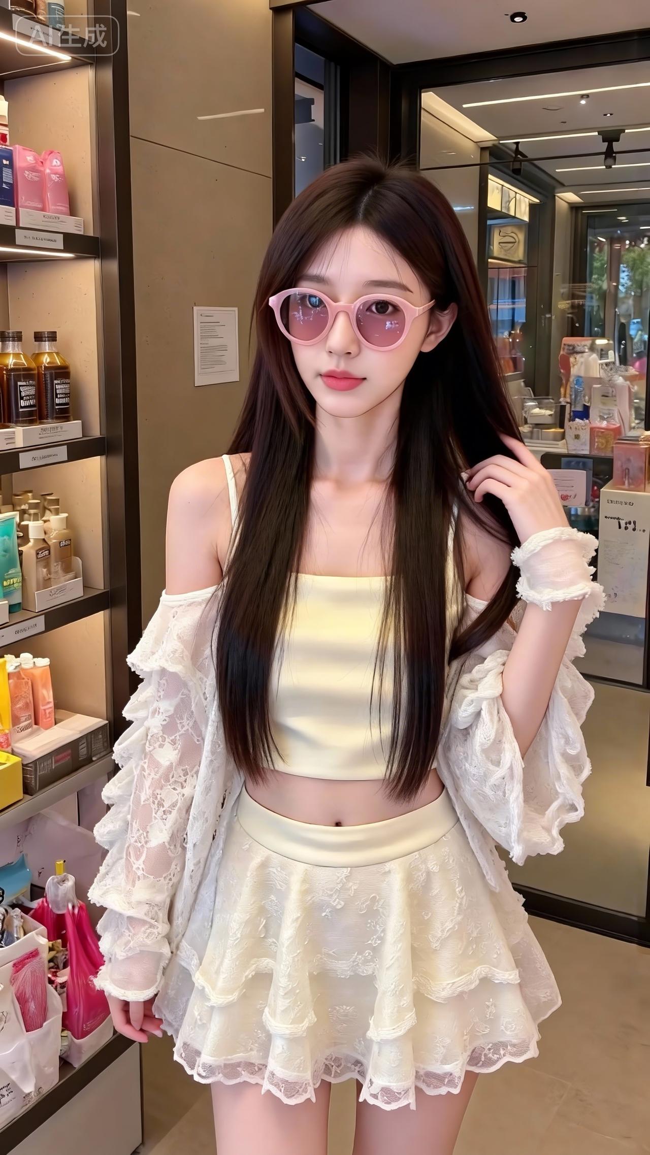 货架旁的暖光里,奶黄套装裹着软甜,纱袖轻搭肩头,粉框镜晃出星星眼。她指尖一抬,连零食柜都浸了甜糯的气息。 日常甜妹穿搭