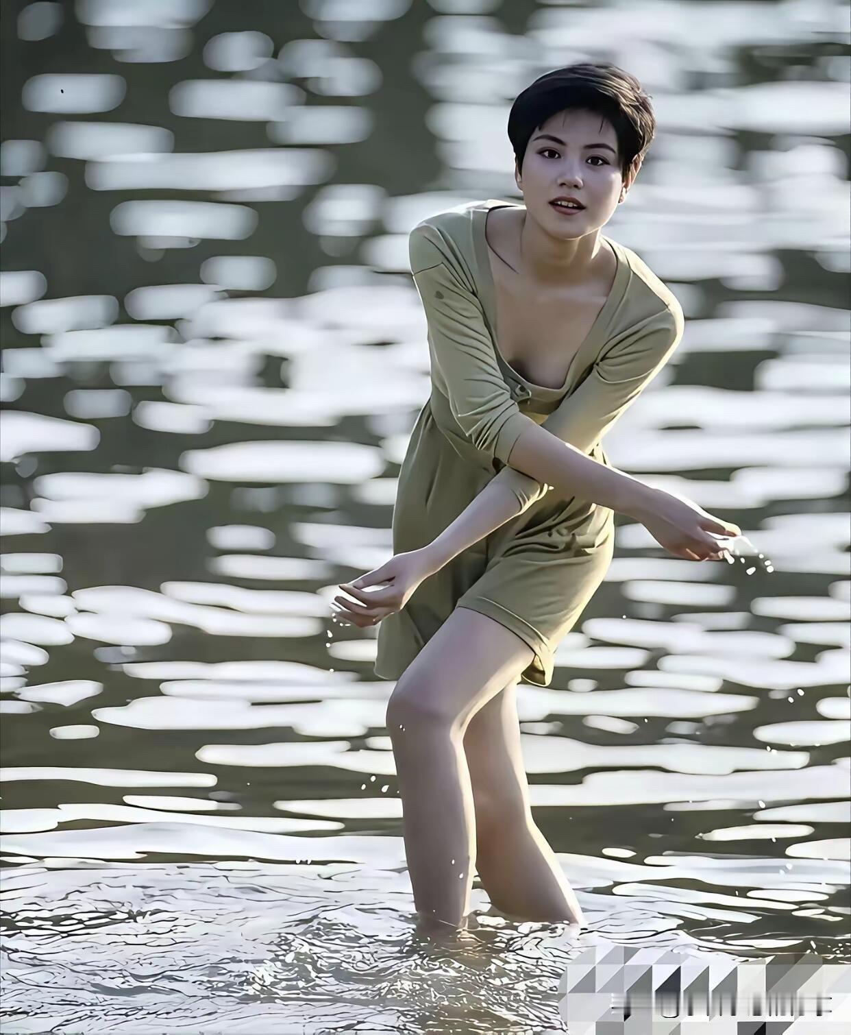 年轻时候的她在海边玩水时留下的一张照片,那时的她留着短发,五官有点硬朗,属于颜值一般,但是有唱功有实力的一位歌手,不知道你能一眼就认出她吗,喜欢她的肯定也听过不少她的歌曲吧。