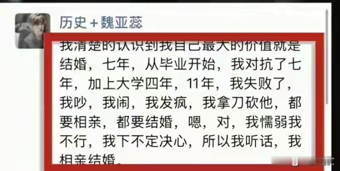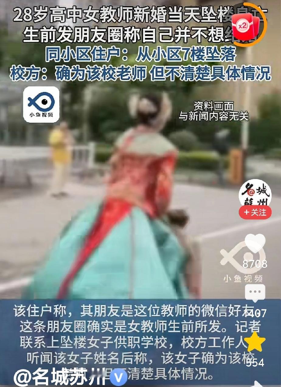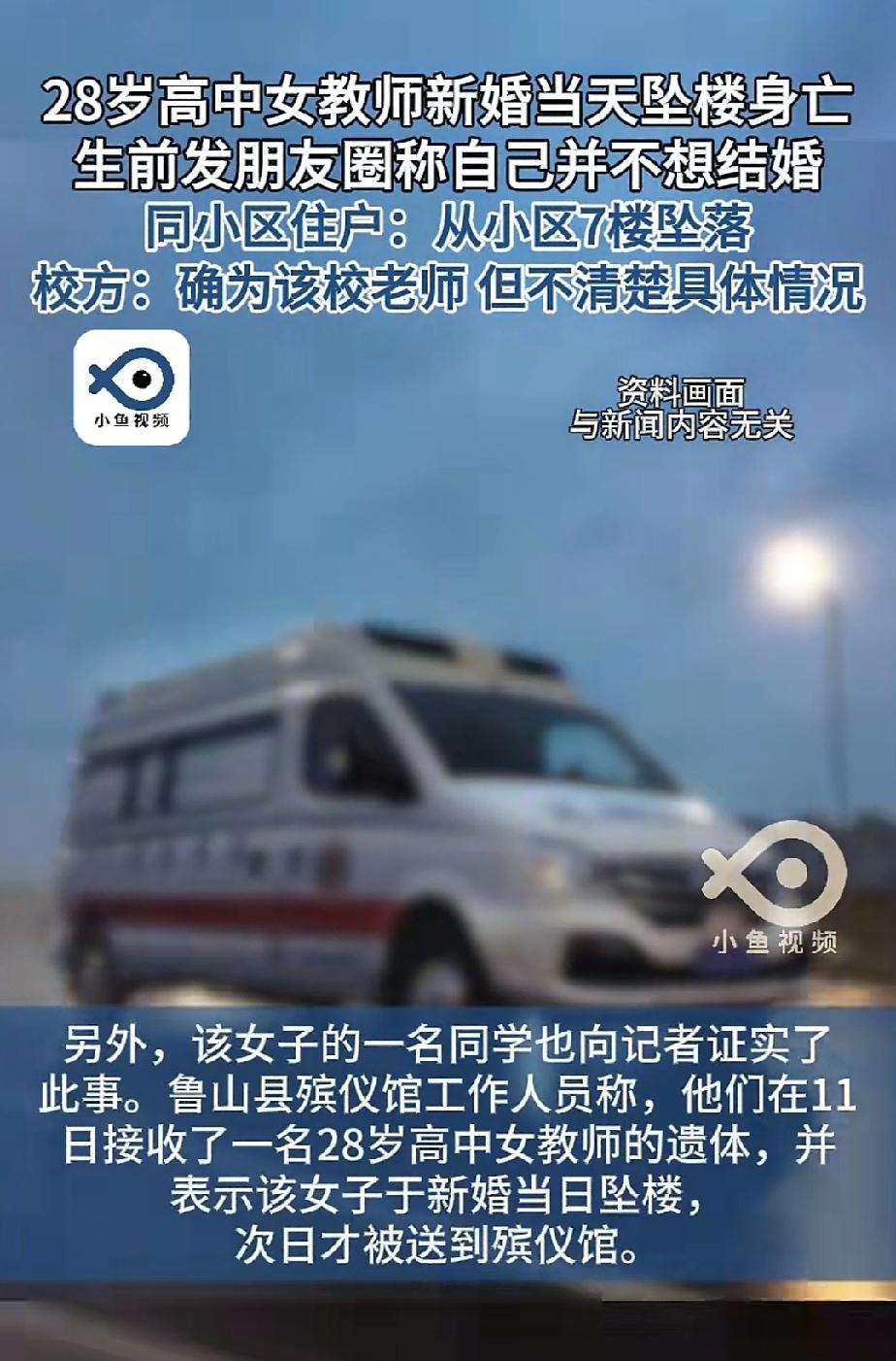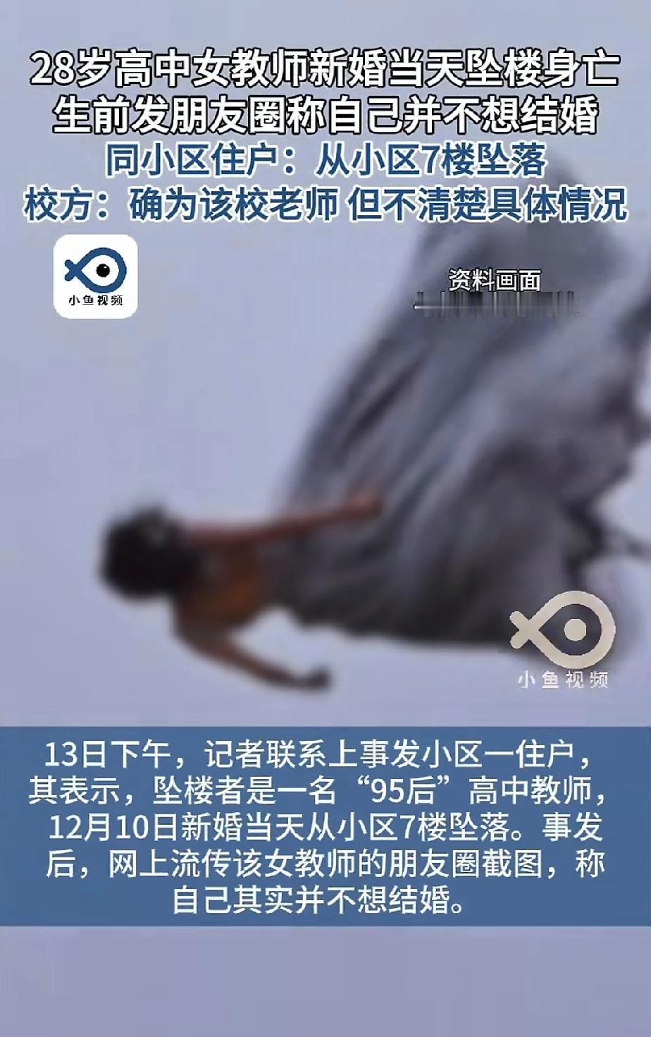 新婚大喜之日,新娘竟然奋不顾身从7楼跃身跳下,结束自己生命,究竟是为了什么? 这是最近发生在河南平顶山市鲁山县,一位28岁的高中女教师在 结婚当天,以这种沉重的方式寻了短见,很多人都纳闷,她这么做的原因是什么? 难道是女孩年龄大了,28岁,不好嫁人了吗?据说,女孩在三年前,以第一名的成绩考进了当地一所高中,成为一名历史老师。要说女孩也够优秀,应该很有见识,有能力,怎么就走了绝路了呢? 到底什么是压倒骆驼的最后一根稻草? 看到女孩自己发的朋友圈,应该可窥一丝端倪。原来,女孩子一直就不愿意嫁人,从一开始就进行抗争,抗争了11年,应该从高中毕业就进行反抗了。 看来,她与原生家庭的关系不怎么样,这11年都是与家庭做斗争来的,哪里还有爱可言。并且她把自己的银行卡密码和身后事,都托付给朋友,这得是对家人多么失望,才选择的这么做? 再加上所嫁之人有可能也不投缘,双方相逼,才导致心灰意冷,最终选择了这条最难的路。 这也是个傻姑娘,死都不怕,还怕其他的,不行远离这个地方,自己有文化,一样可以好好活着,就算苦点也比死去强。 现在说什么都晚了,但愿,走好天堂路,来生不再有苦痛! 图片来自网络,侵删致歉!